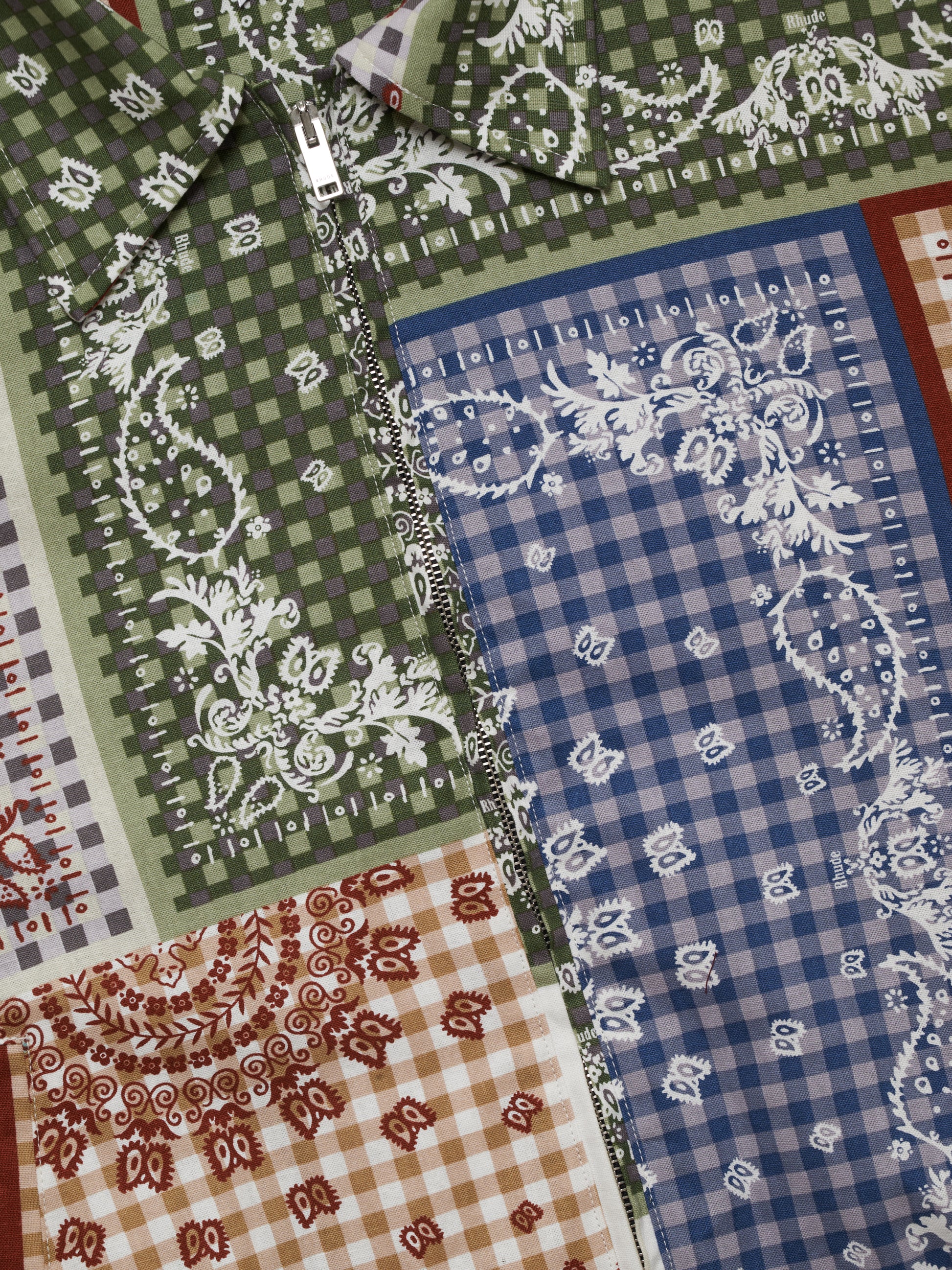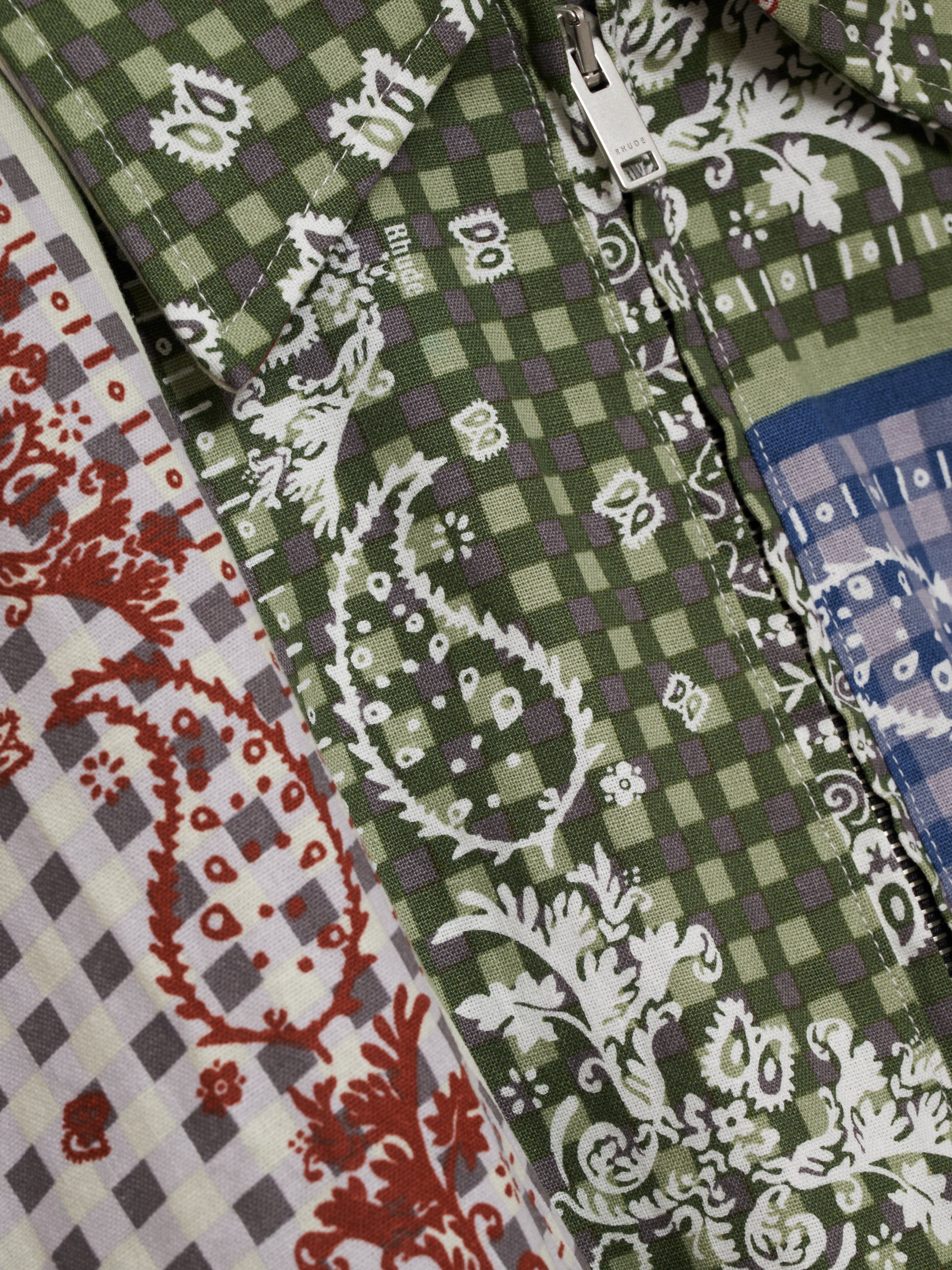 Premium jacket signature bandana patchwork printed throughout the jacket. Twin patch pockets at front. Two-way zipper closure with custom Rhude Pill hardware.