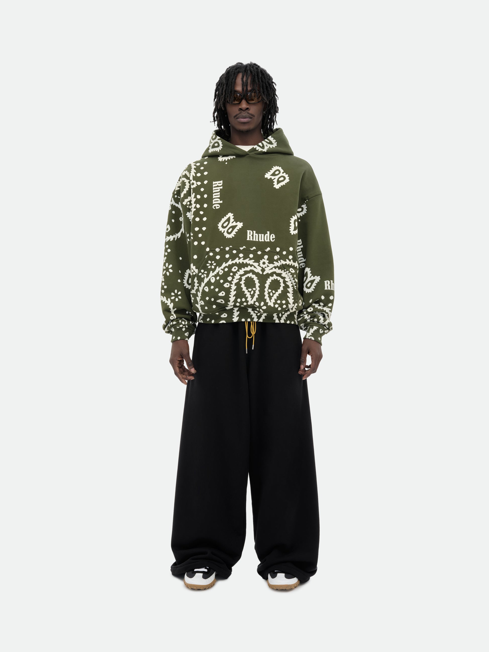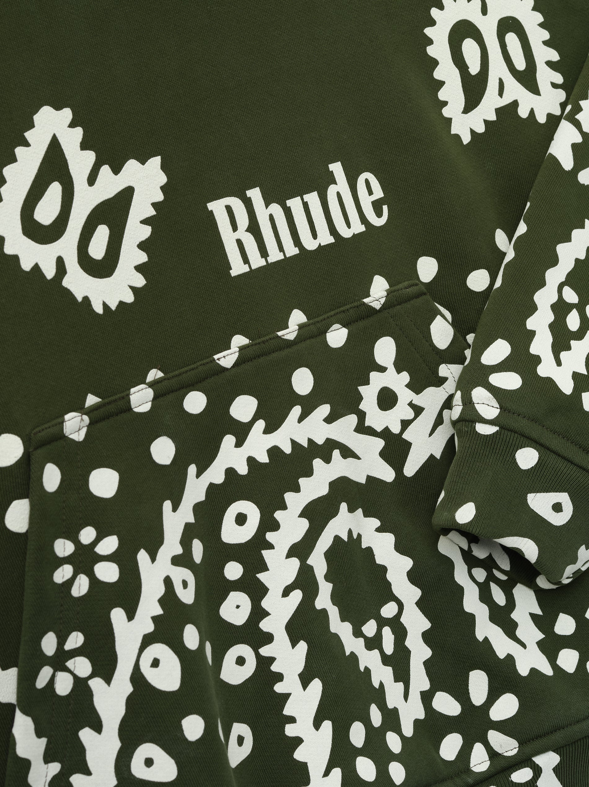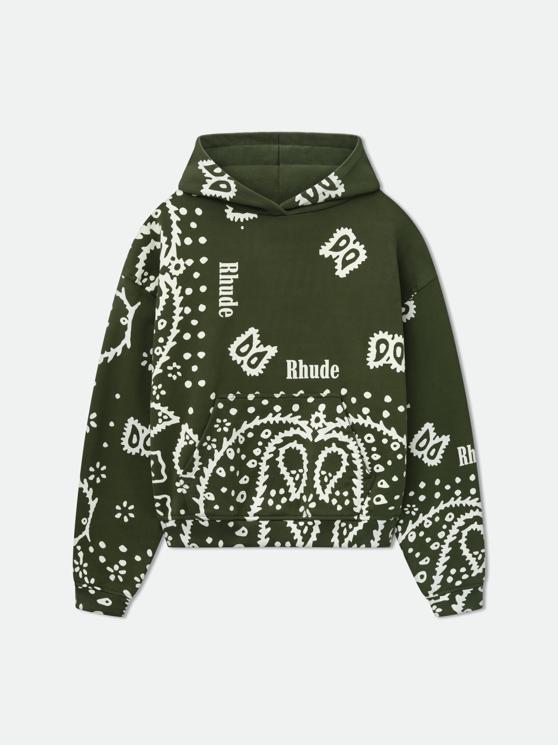 Long sleeve heavyweight cotton hoodie with all over bandana motif pattern printed throughout. Featuring a kangaroo front pocket and dropped shoulders. Each piece is unique and print distressing my vary per style.