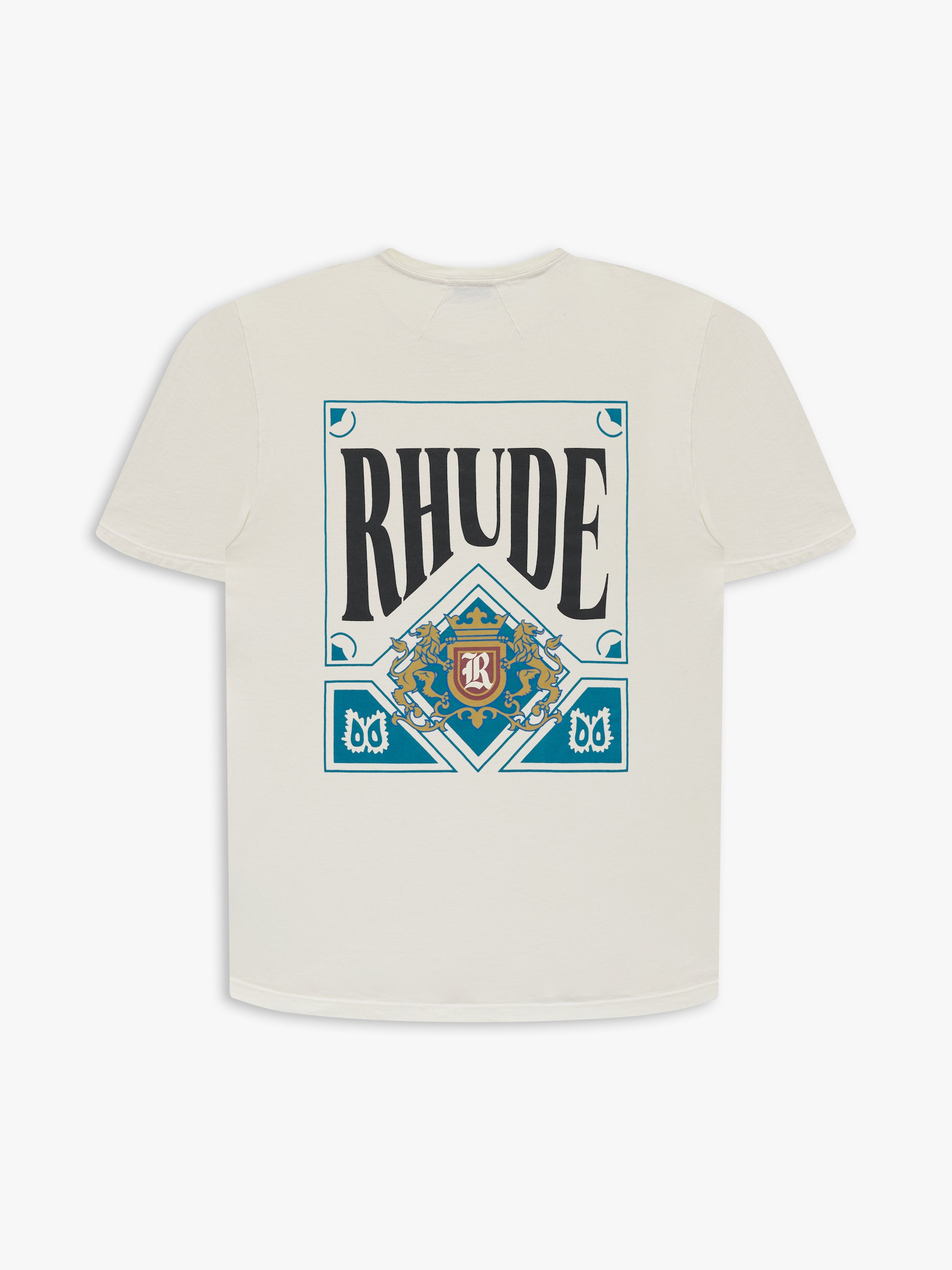 Custom-fit vintage wash cotton short sleeve tee-shirt with Rhude "CARD" graphics printed at front chest and back.