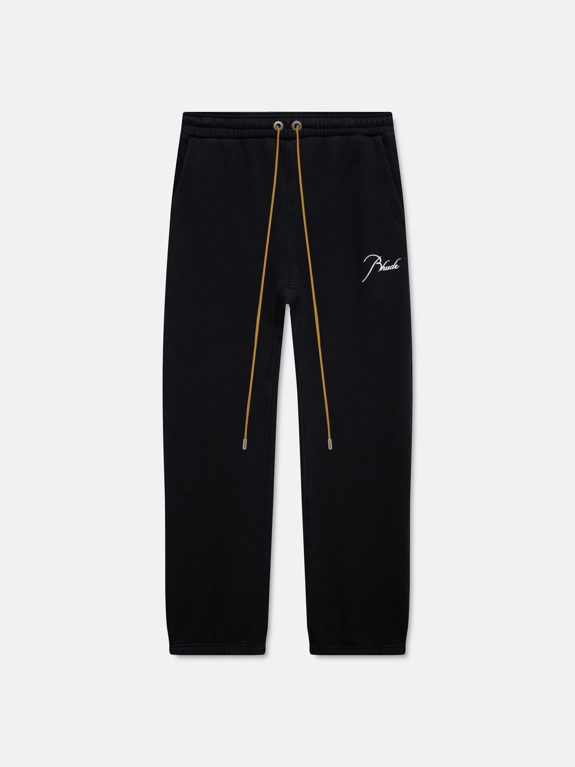 Heavyweight cotton sweatpant with signature Rhude script logo embroidered on the front featuring our exaggerated drawstrings in mustard tone. Finished with structured cuffed ankles.