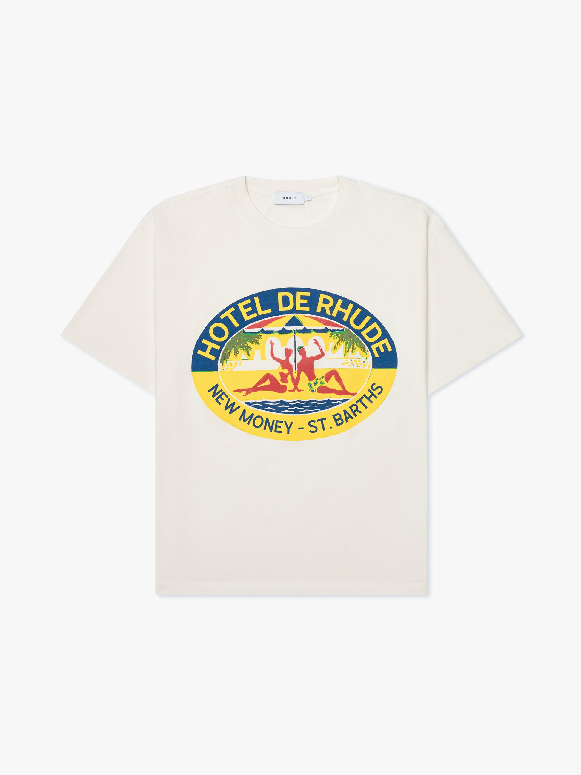 Custom-classic fit cotton tee shirt with a ribbed neckline and short sleeves. Features Hotel de RHUDE - New Money St. Barths graphic design printed on front.