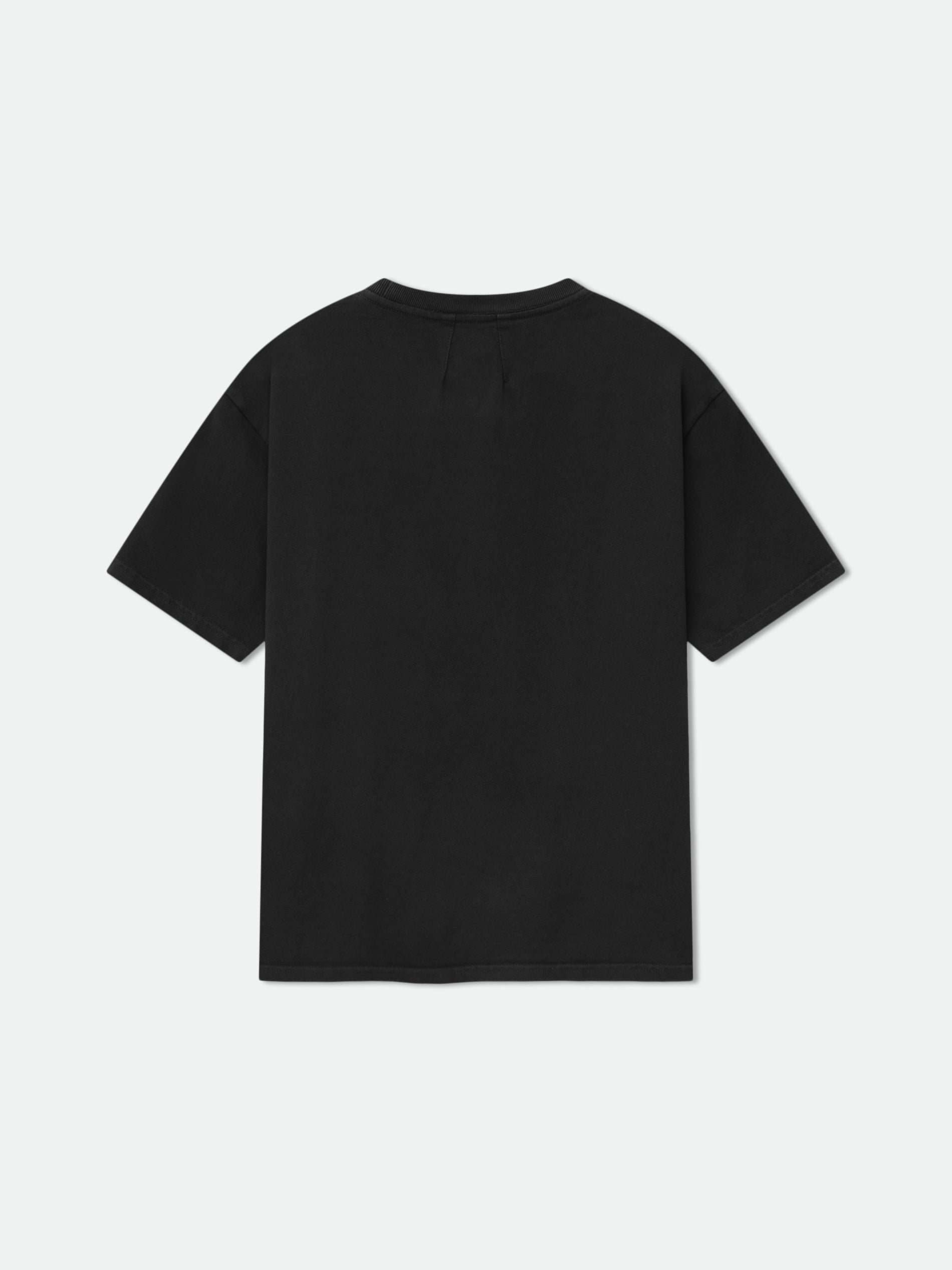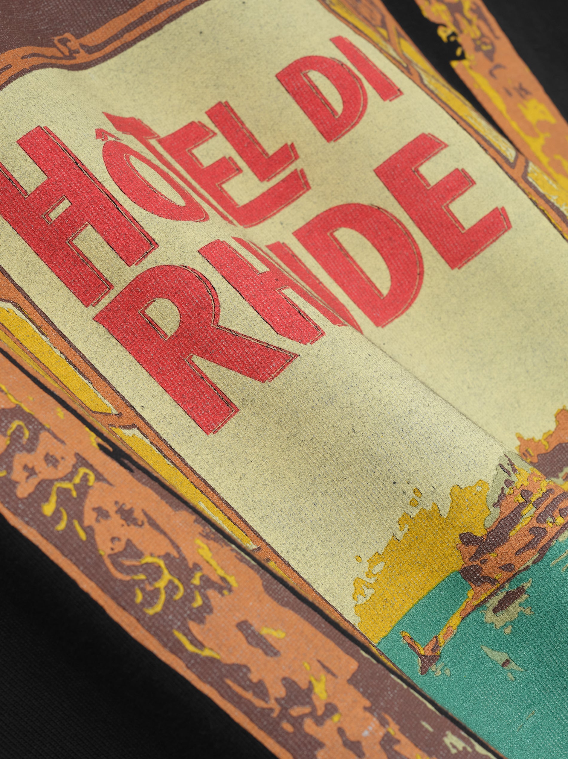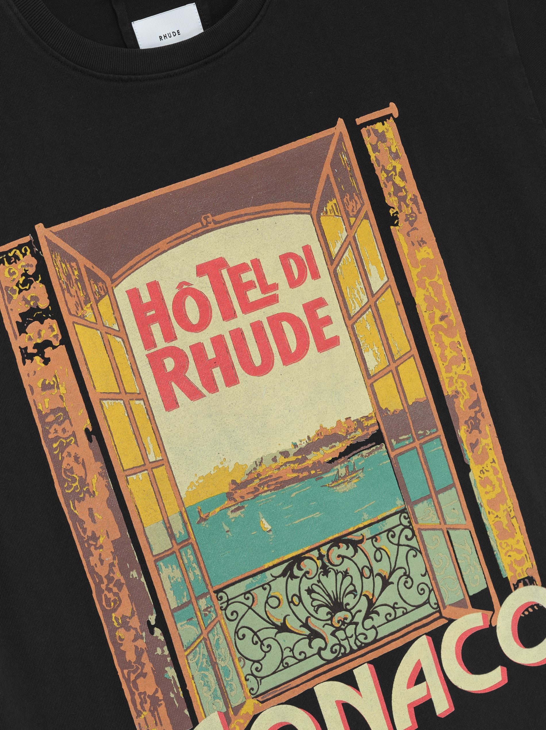 Custom-fit vintage wash cotton short sleeve tee-shirt features a ribbed neckline, with Rhude "Hotel di Monaco" inspired graphics printed at front, and with a clean back.