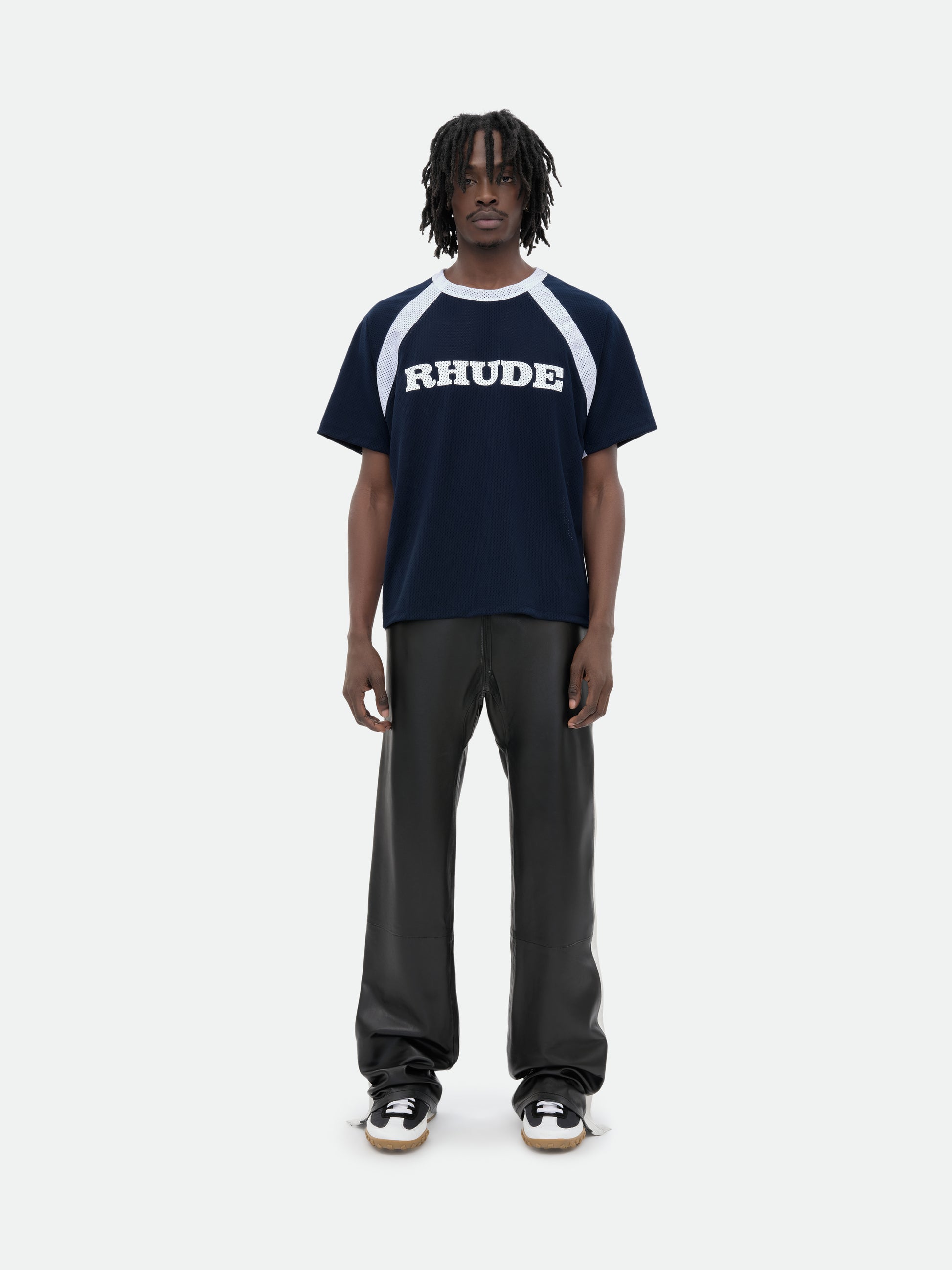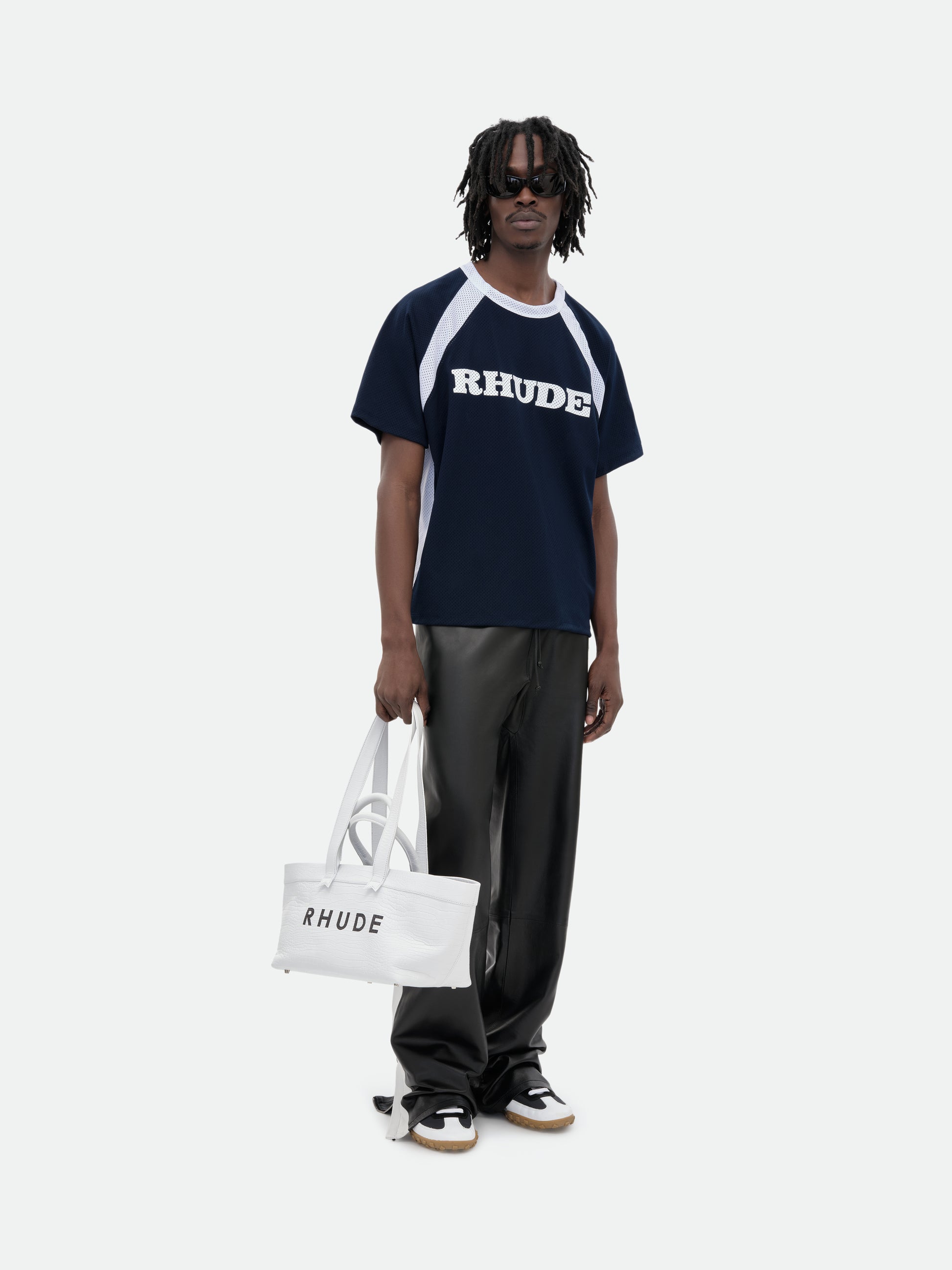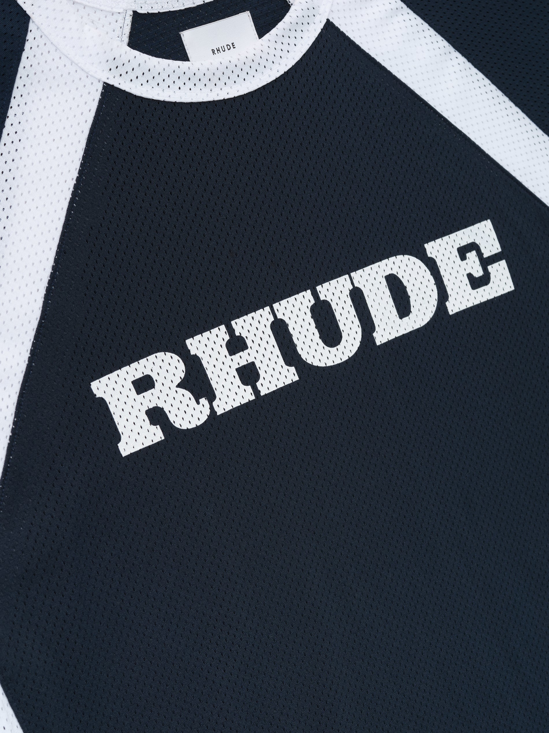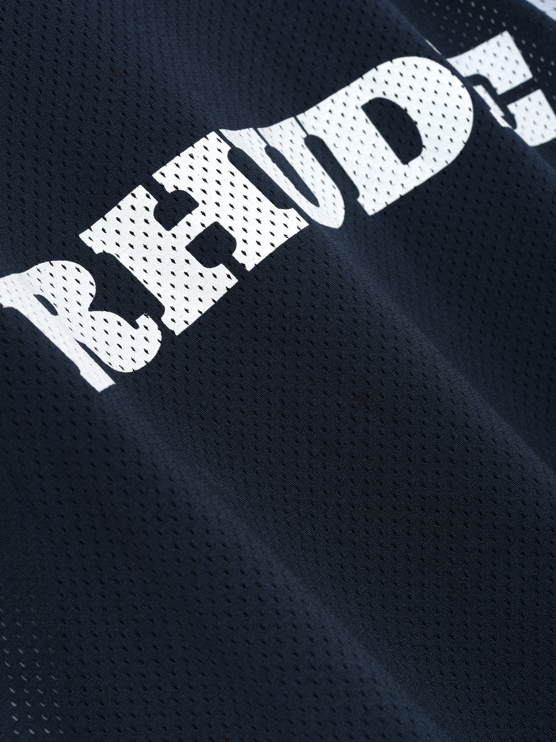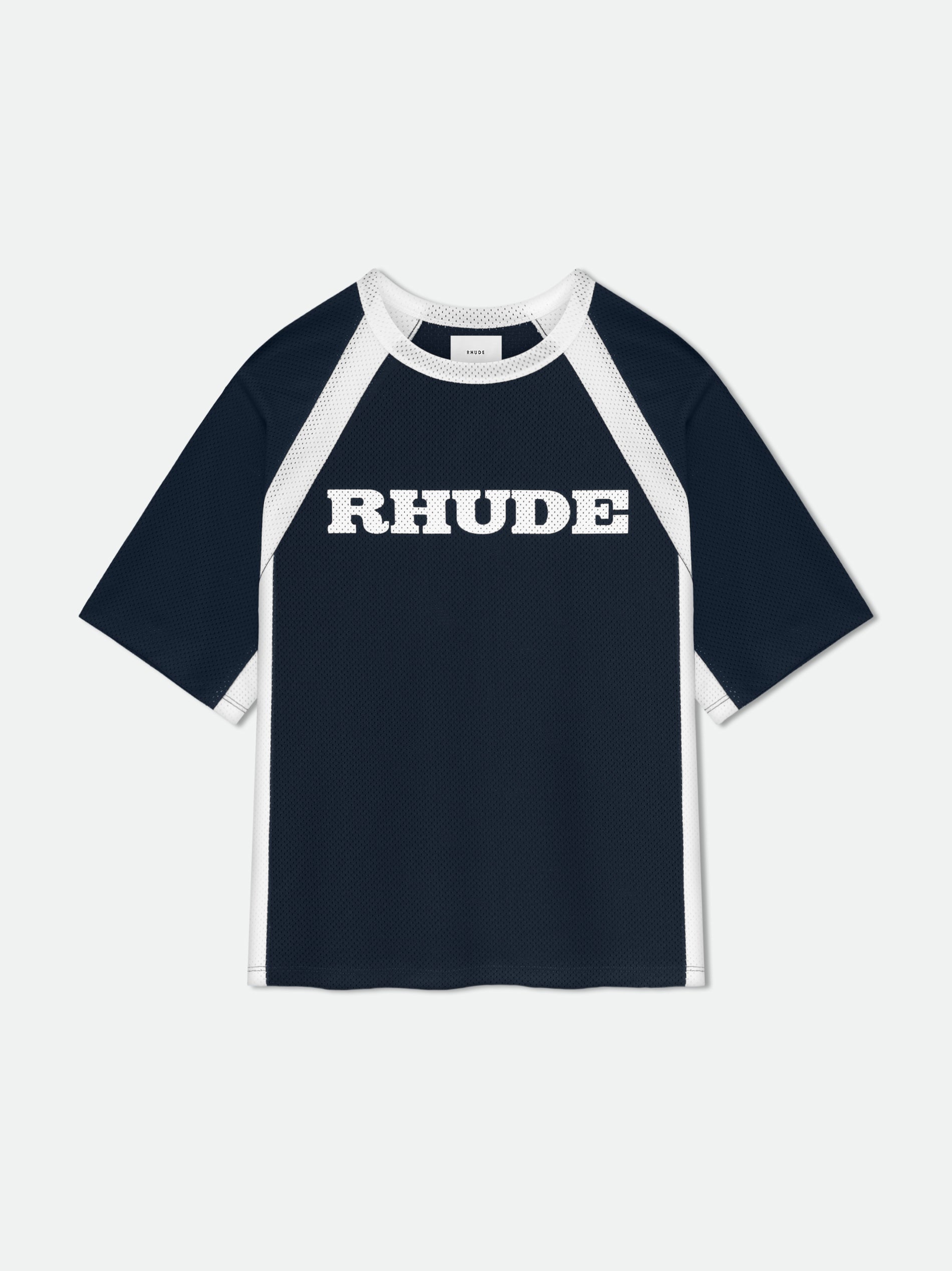Premium tee crafted from soft, lightweight fabric. Rhude jersey logo graphic showcased on the front. Features a comfortable and relaxed custom Rhude fit. The dropped shoulders adds a sporty touch to this classic short sleeve.