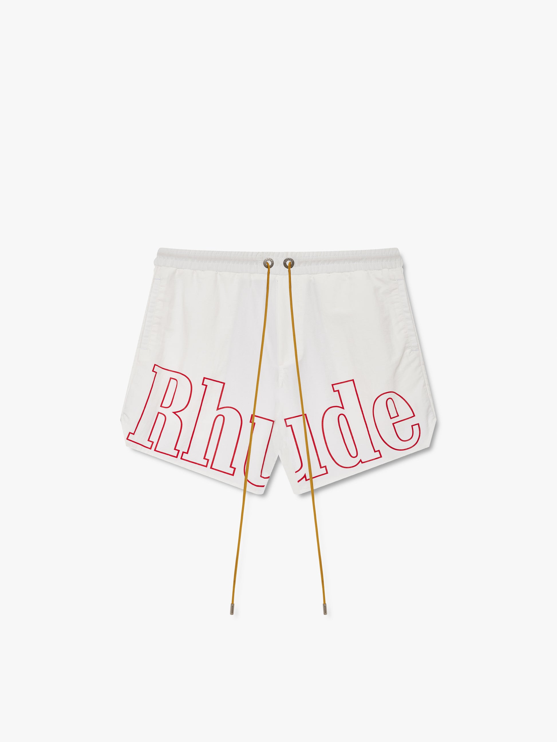 Premium track shorts featuring Rhude logo printed across front thighs, an elasticated waistband, twin side pockets, and a custom Rhude chevron singular back pocket. Exaggerated front drawstrings in our signature Mustard tone.