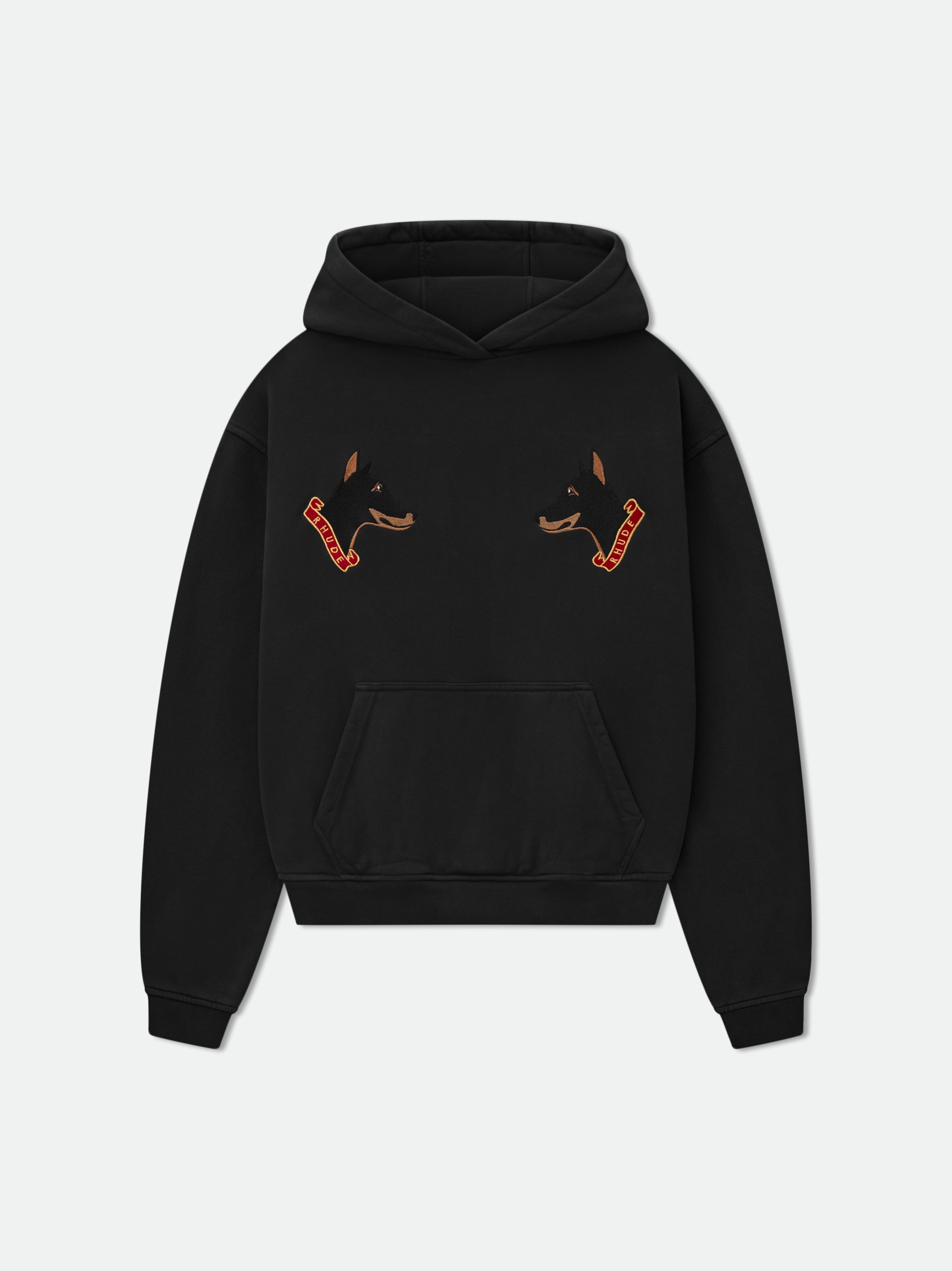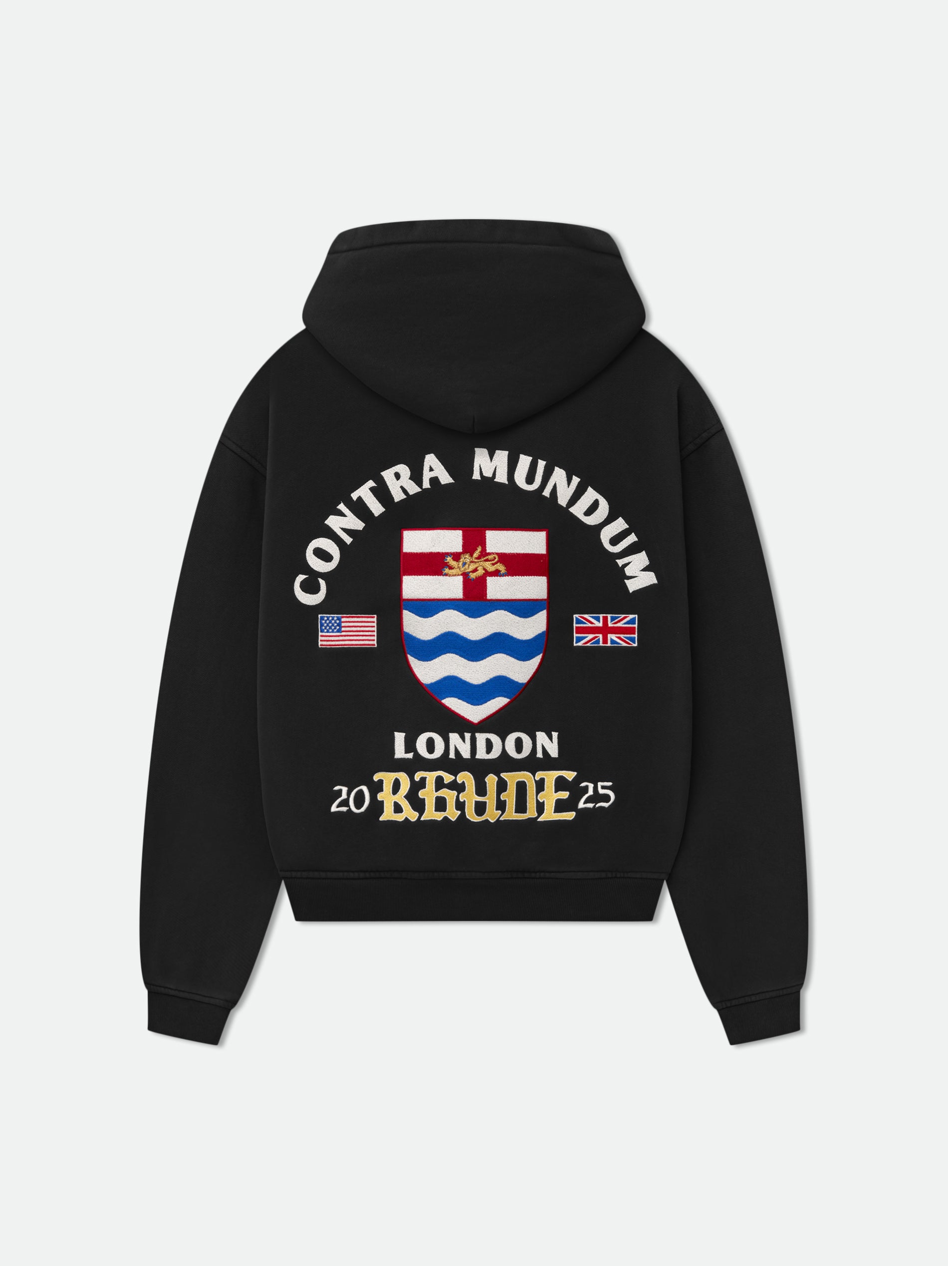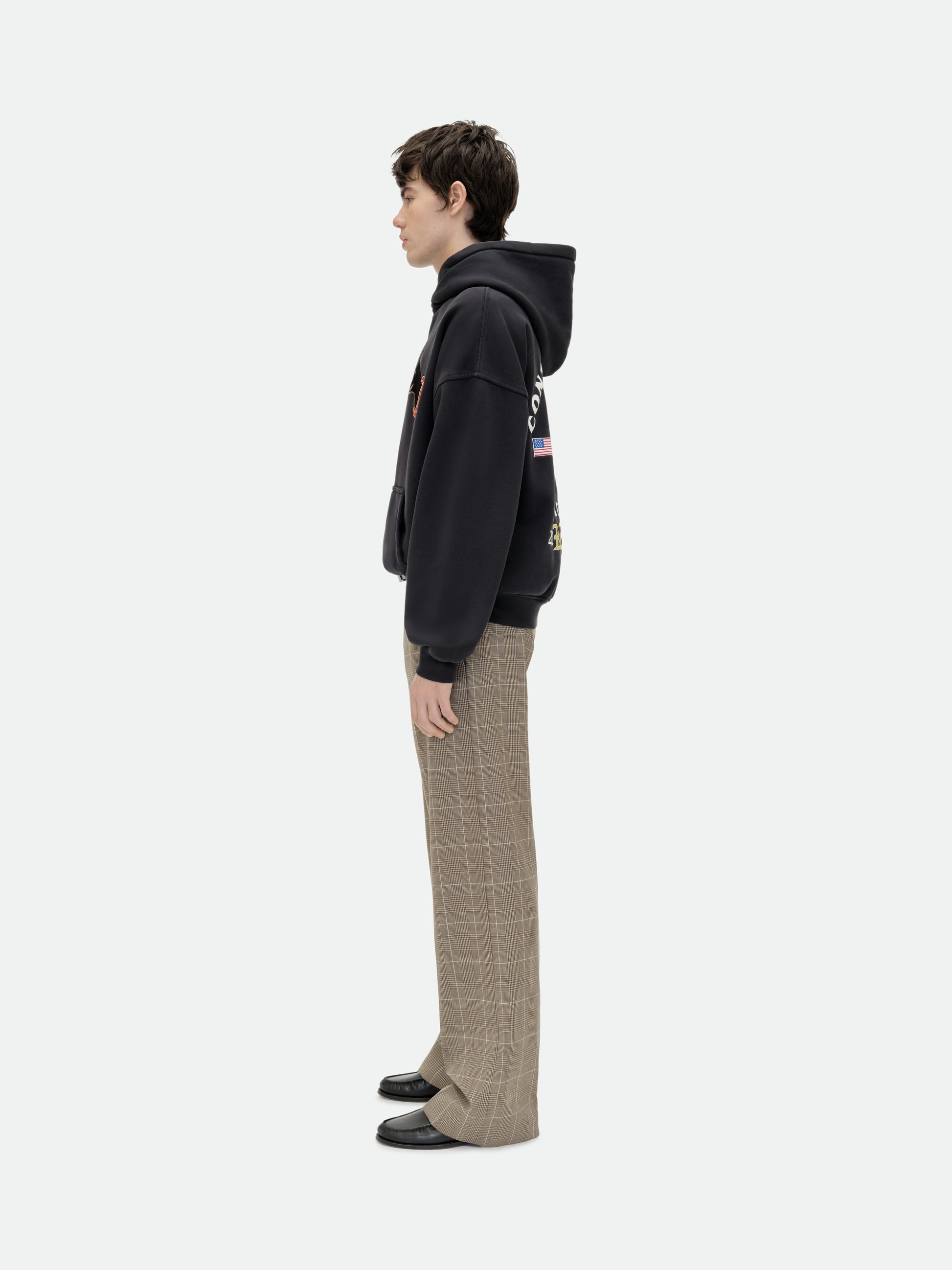 Long sleeve French Terry hoodie with Rhude london hounds on the front, with a rhude designs throughout the back. Featuring a kangaroo front pocket and dropped shoulders. Each piece is unique and print distressing my vary per style.
