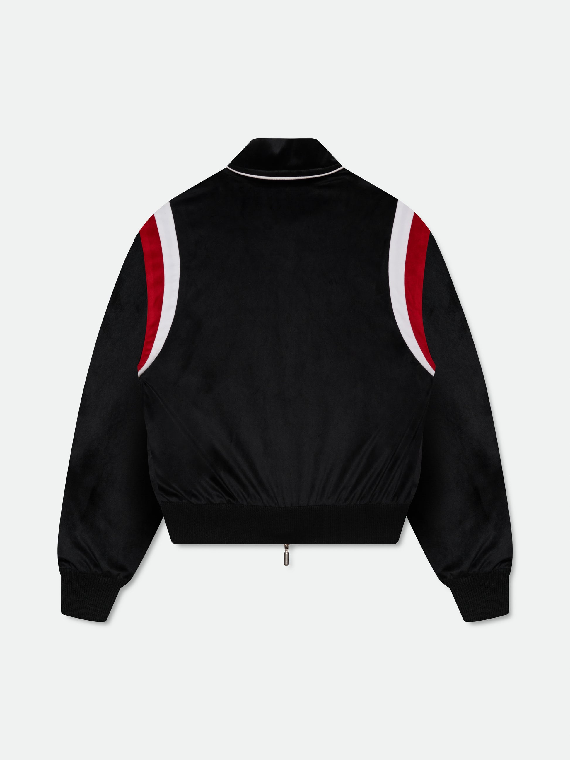 Velour track varsity jacket with Rhude logo on front, and appliques at each shoulder. Finished with a ribbed waist and cuffs for added comfort and style, along with custom two-way Rhude Pill zipper closure.