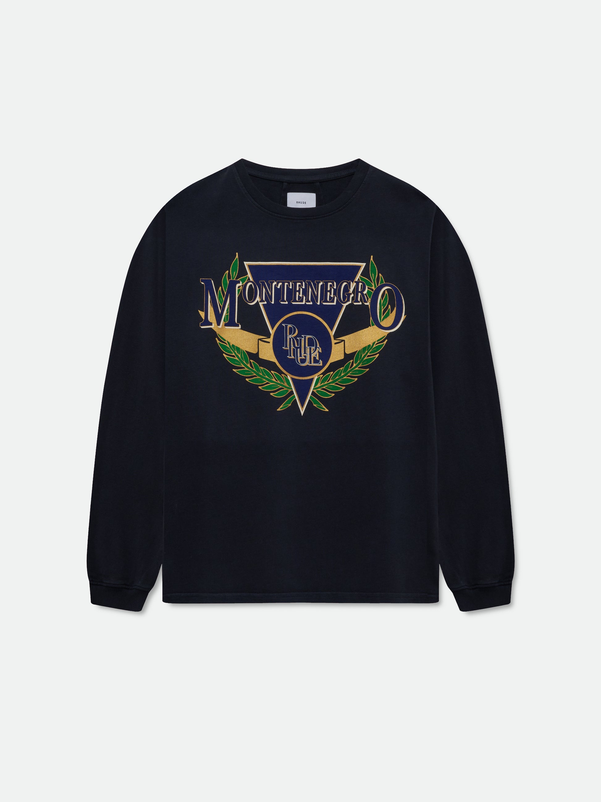 Custom-fit vintage wash cotton long sleeve tee-shirt with Rhude "Montenegro Regatta" designs printed at front, with a clean back.