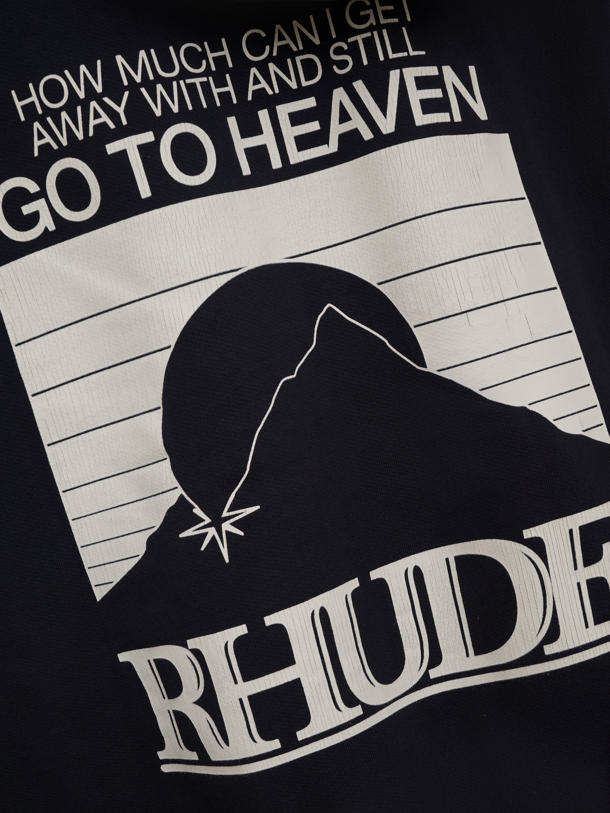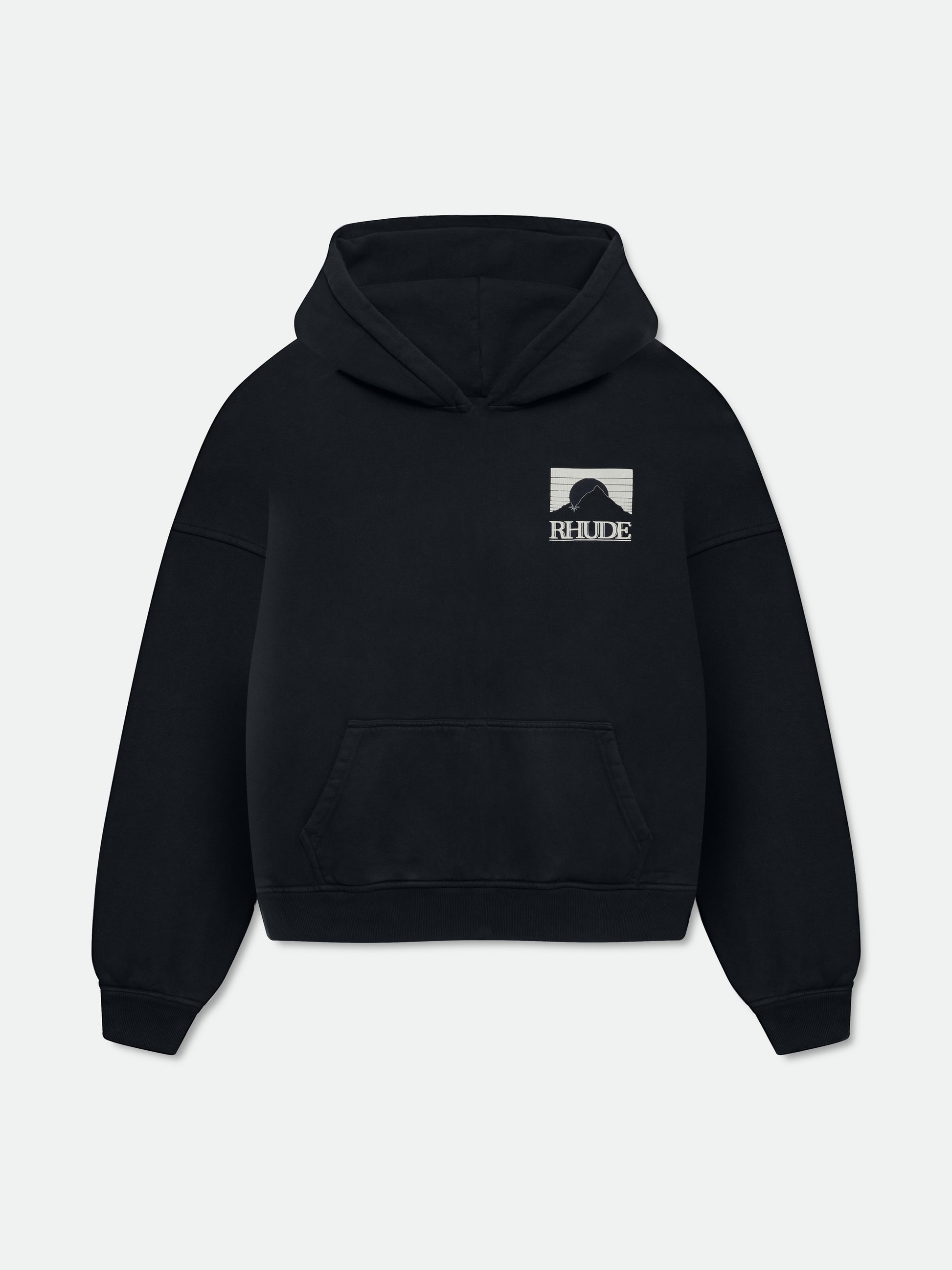 Long sleeve cotton heavyweight hoodie with Rhude "moonlight pack" graphic designs printed on the front and back. Featuring a kangaroo front pocket and dropped shoulders. Each piece is unique and print distressing my vary per style.