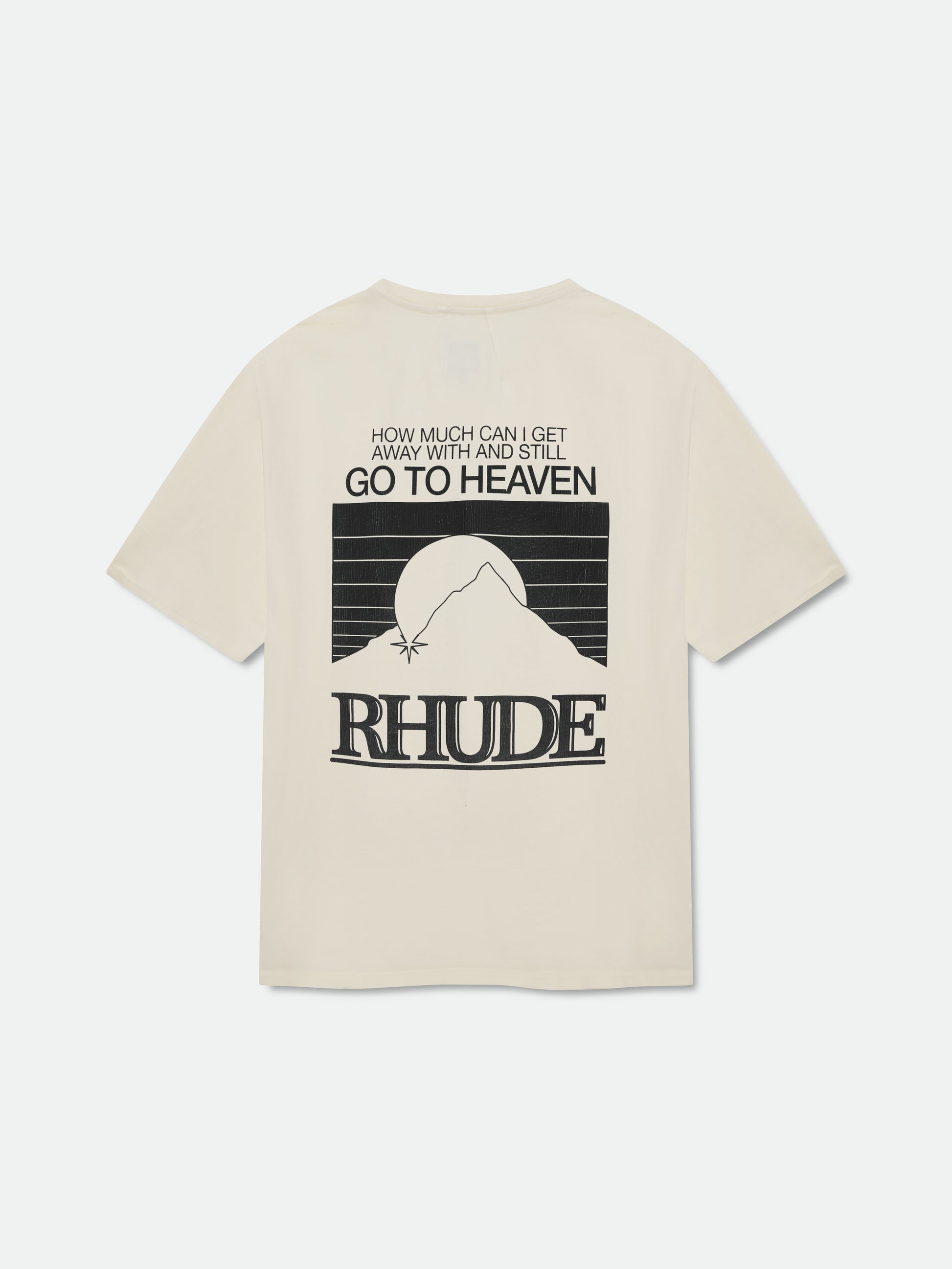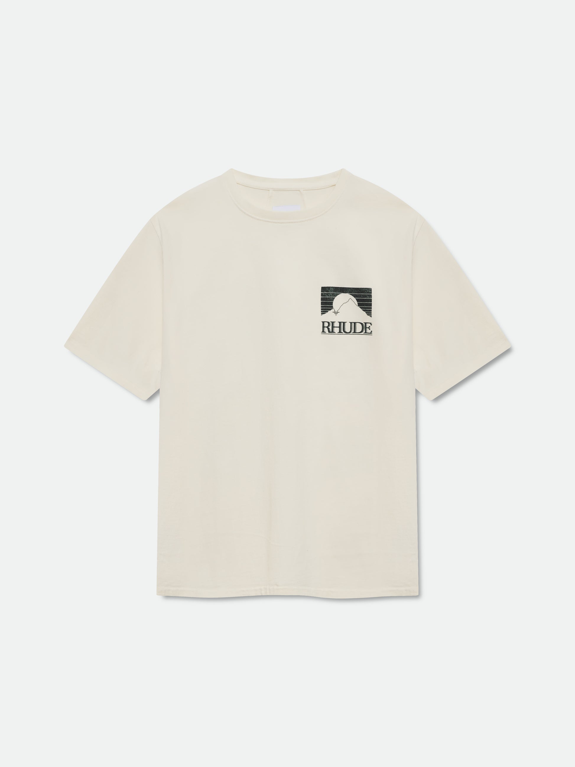 Custom-fit vintage wash cotton short sleeve tee-shirt with Rhude "Moonlight Pack " graphics printed at front chest and on back.