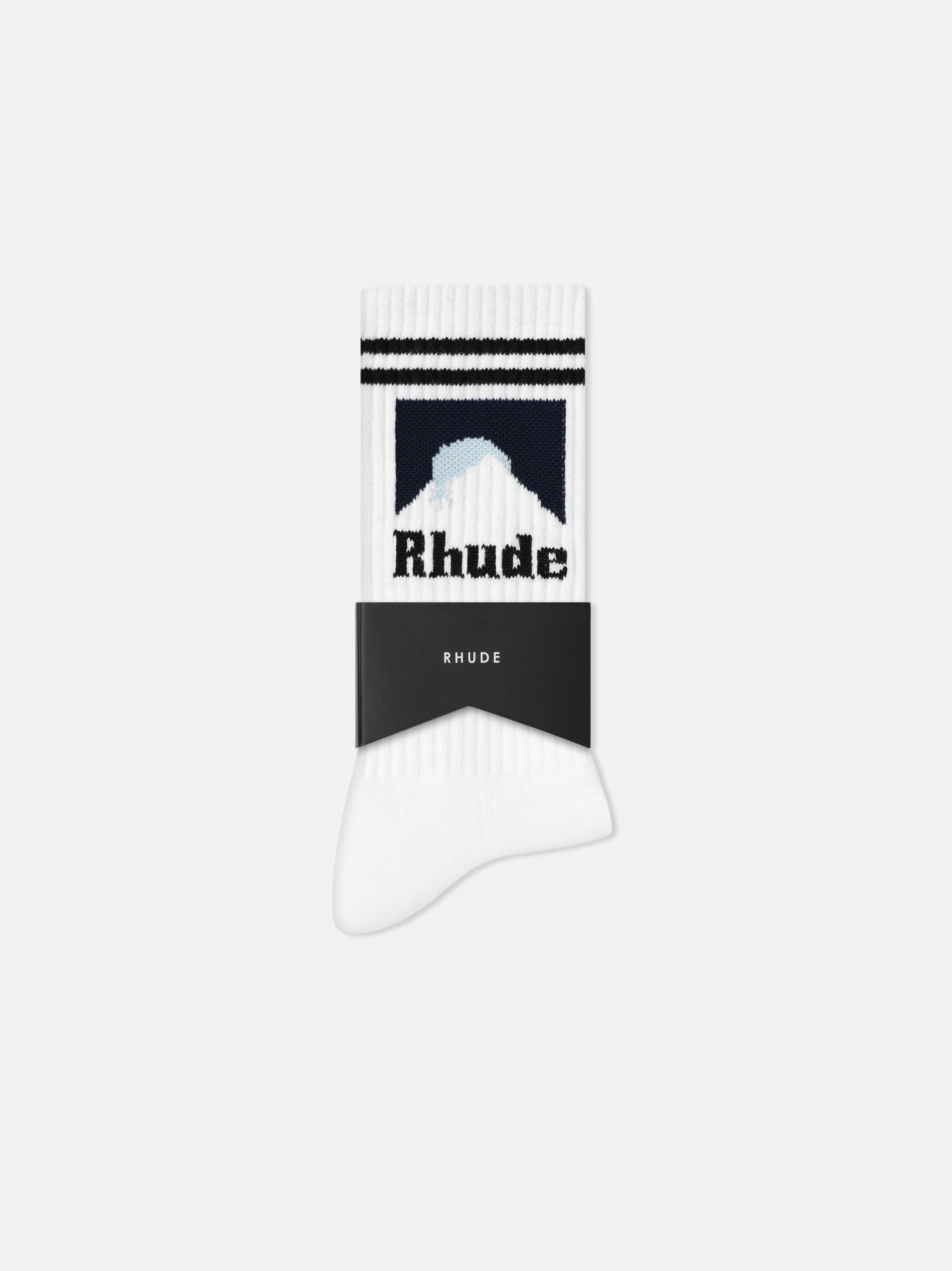Signature cotton-poly sport sock with Rhude moonlight logo. Designed for athletics and leisure activities.