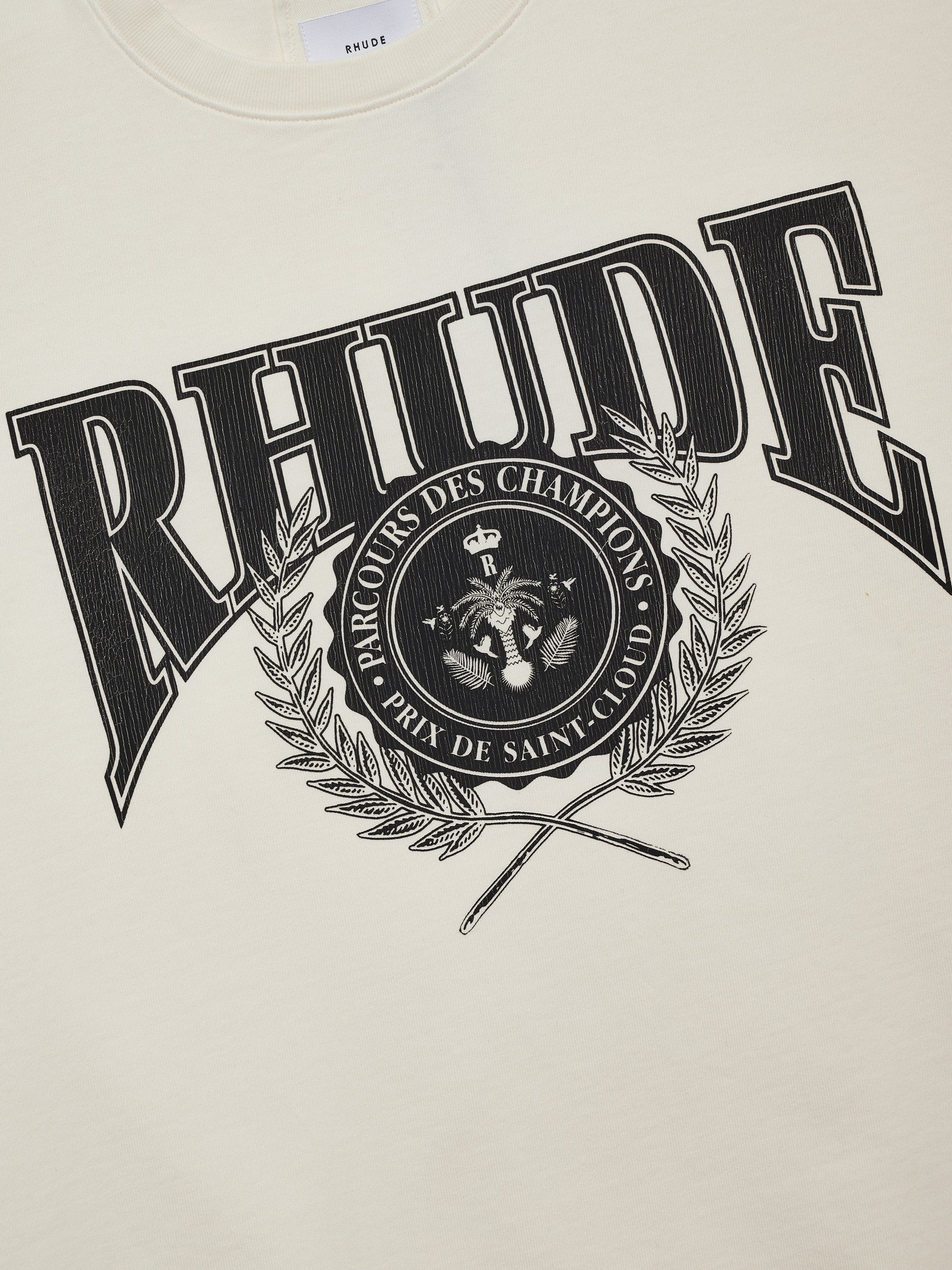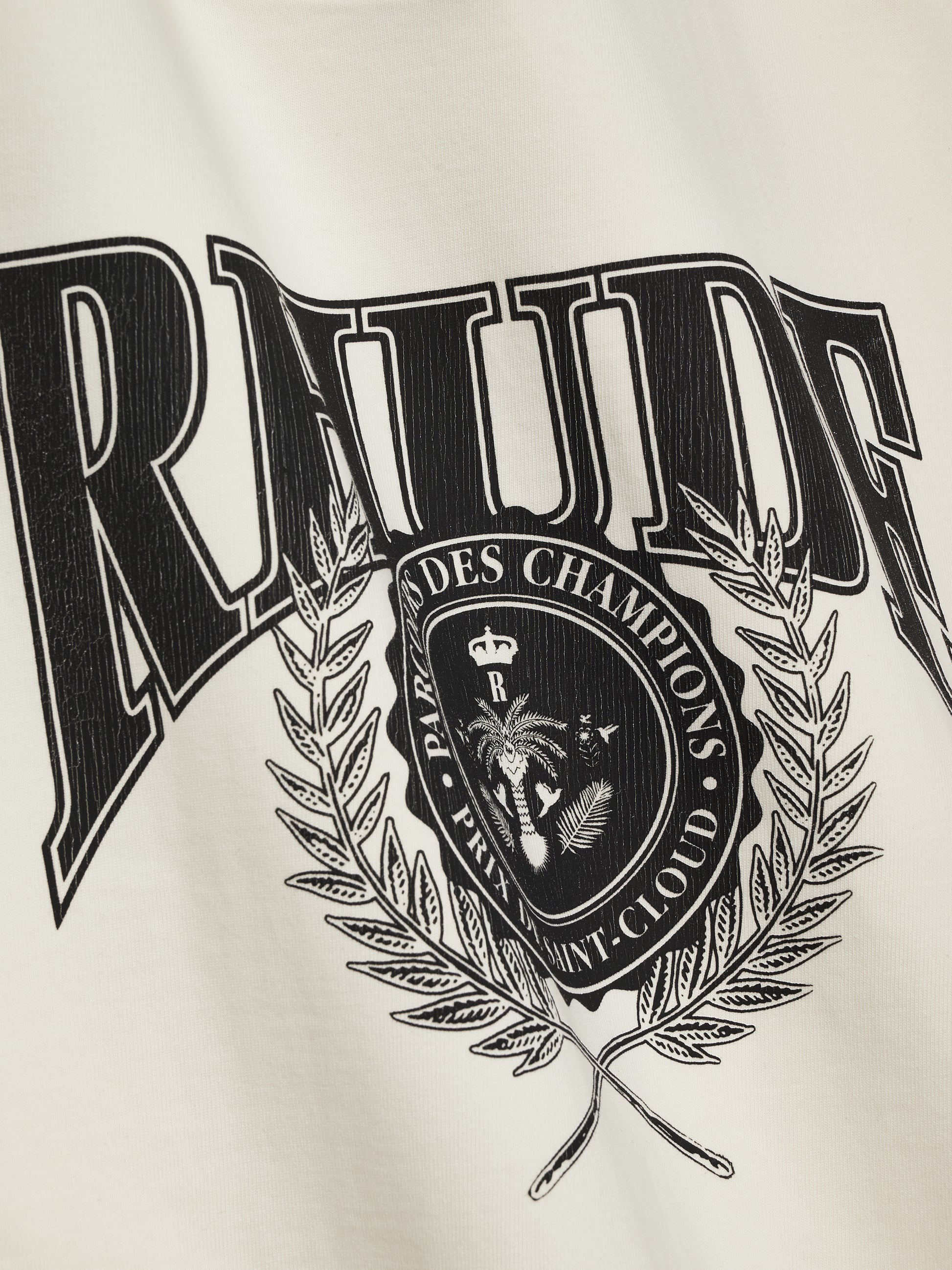 Custom-fit vintage wash cotton short sleeve tee-shirt with Rhude "Parcours Des Champions " graphics printed at front, with a clean back.
