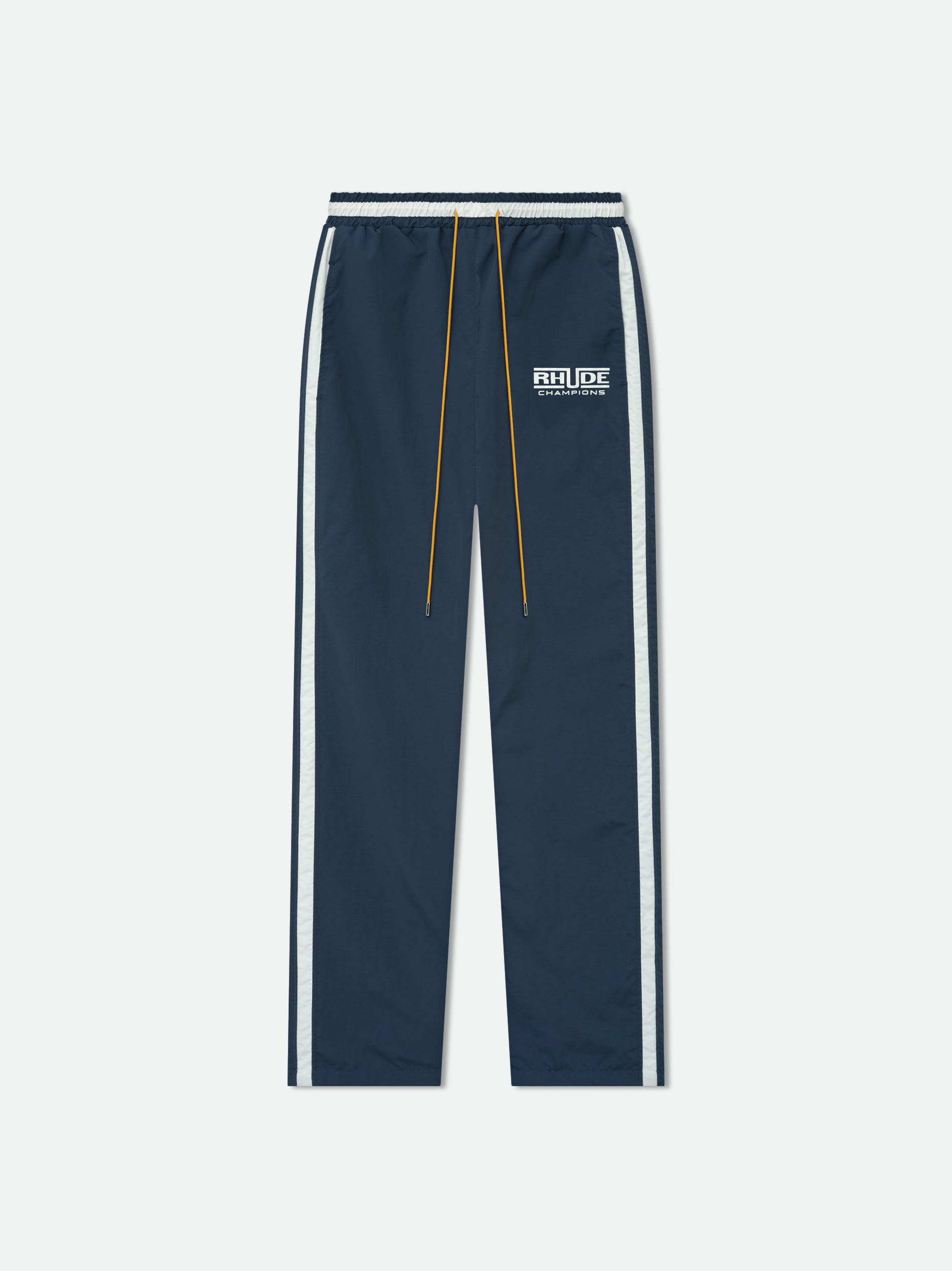 Our classic track pant features Rhude classic logo on front, with diagonal white stripes contrast the front and back of legs, features a cropped hem. Exaggerated drawstring in our signature Mustard tone.