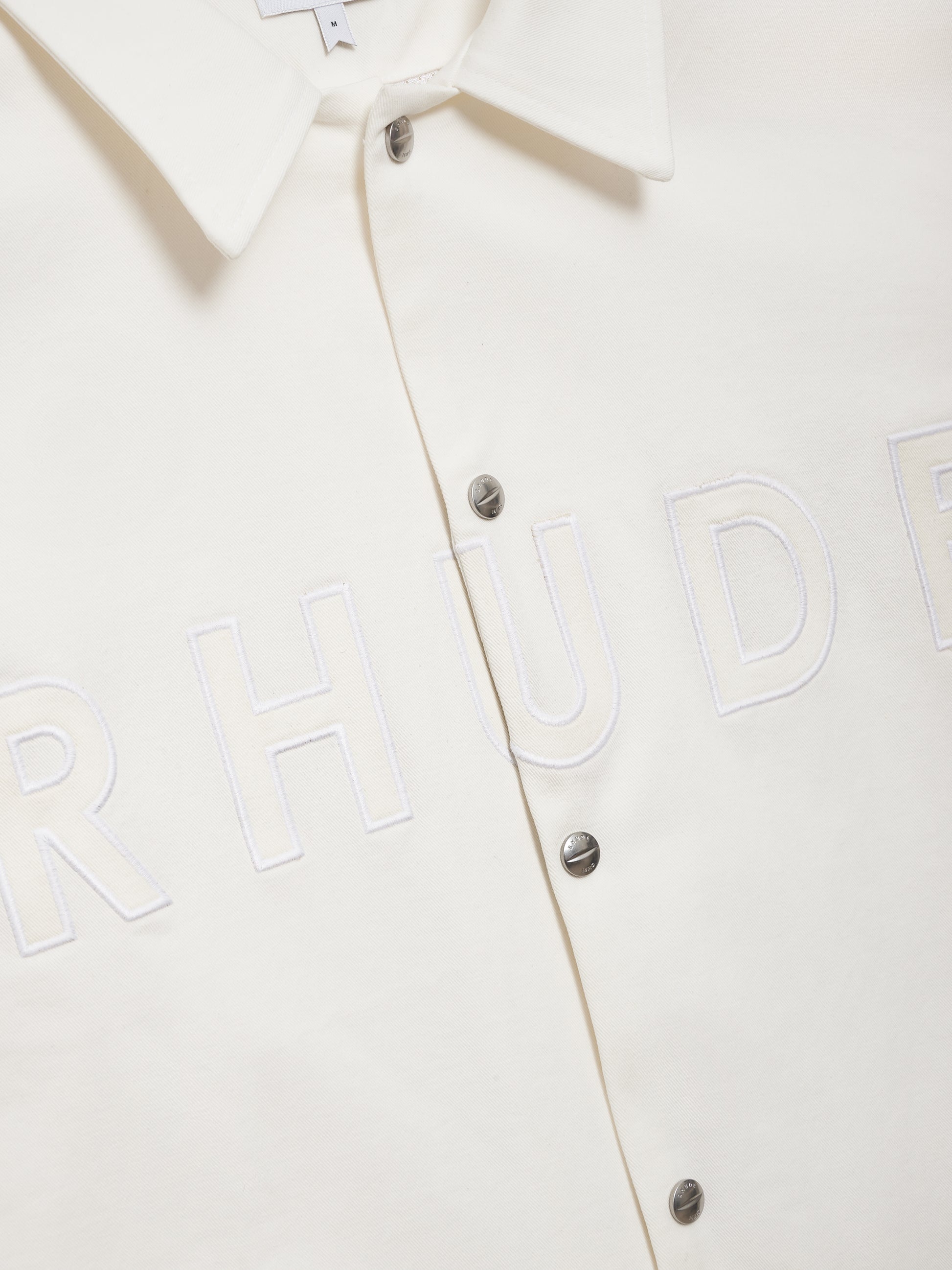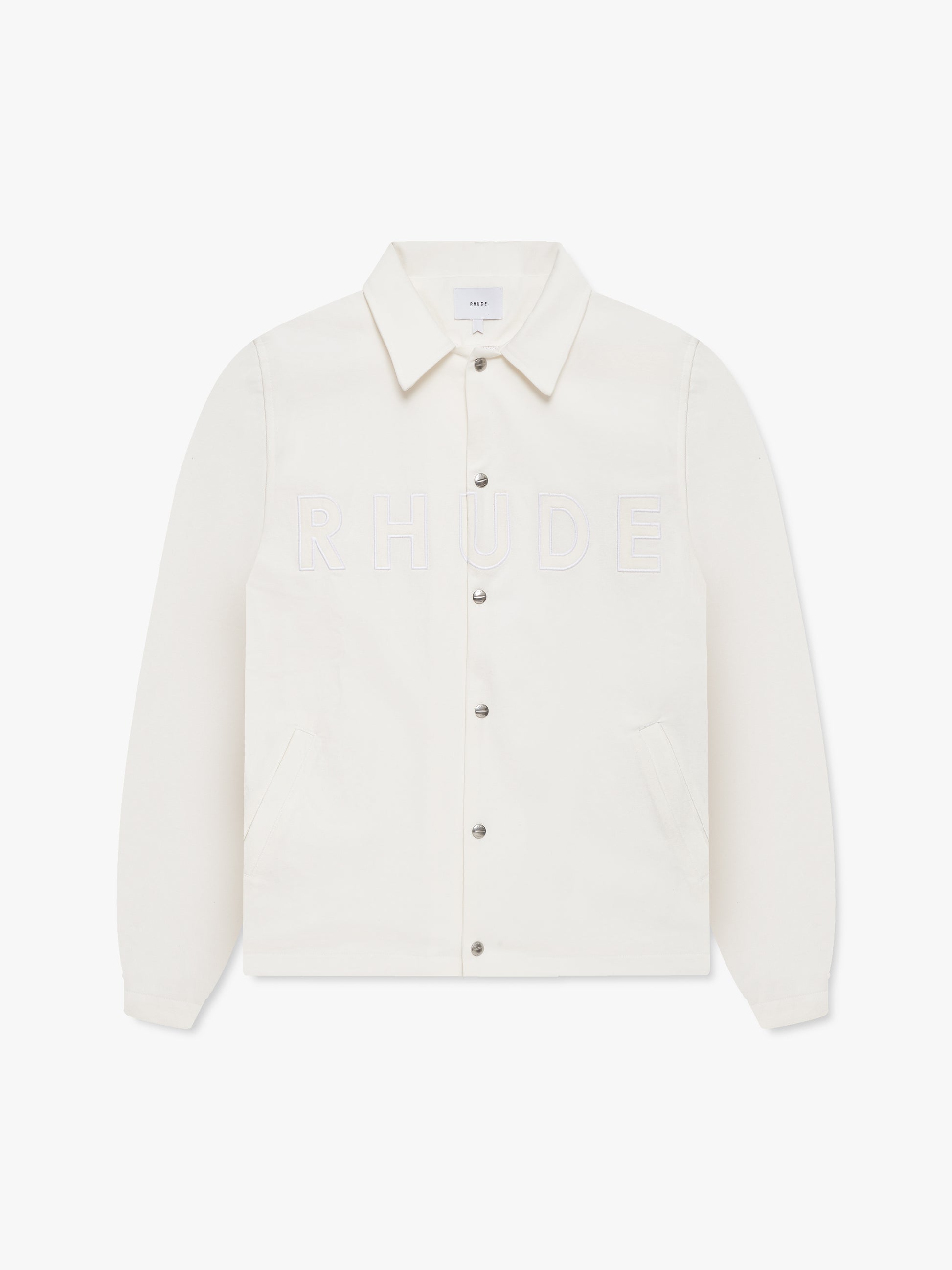 Premium tailored coaches jacket features a sleek camp collar and custom Rhude button closures. RHUDE logo is displayed across the chest.