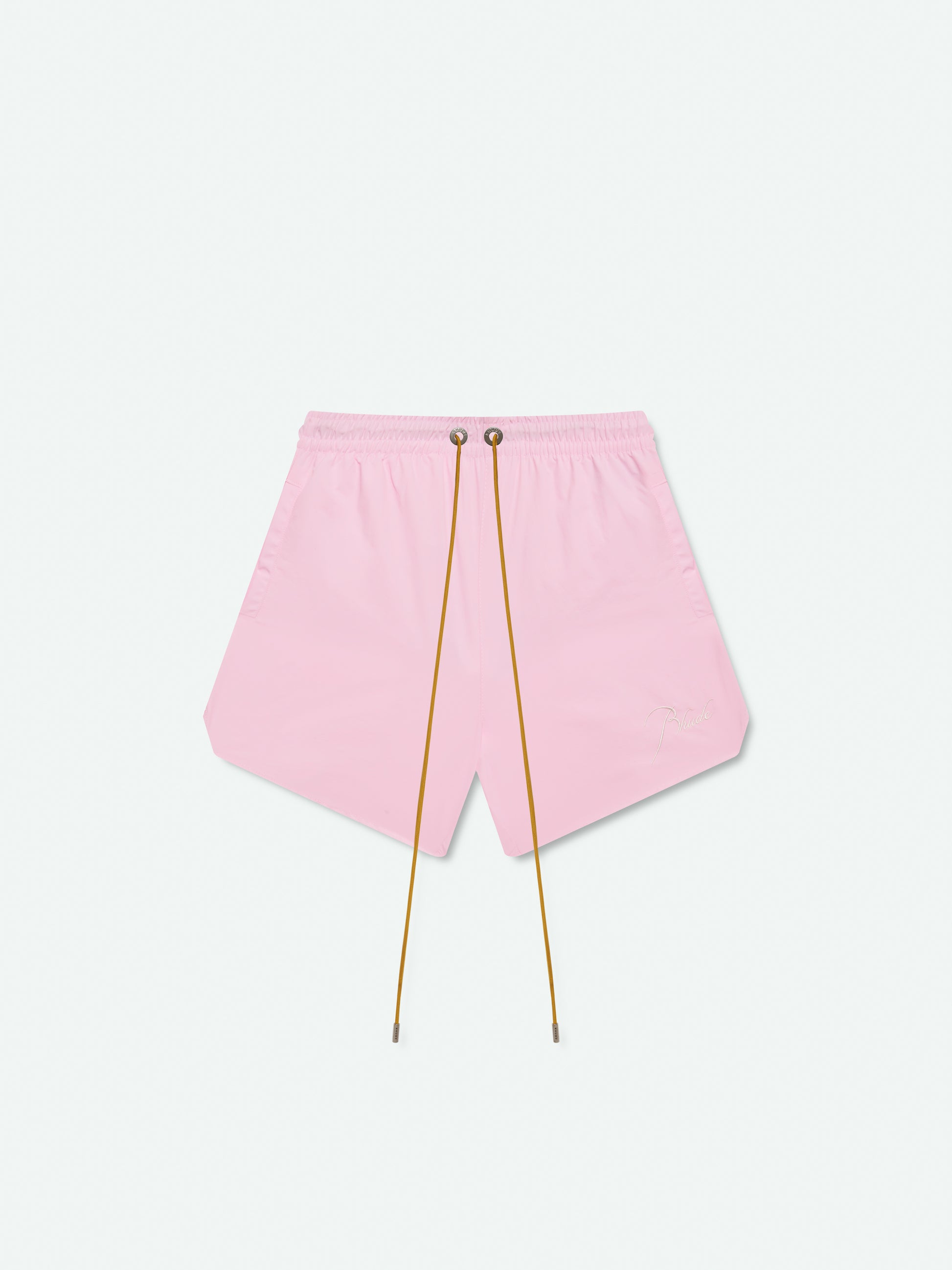 Premium swim shorts featuring Rhude script logo on front leg, an elasticated waistband, twin side pockets, and a custom Rhude chevron singular back pocket with an eyelet. Exaggerated front drawstrings in our signature mustard tone.