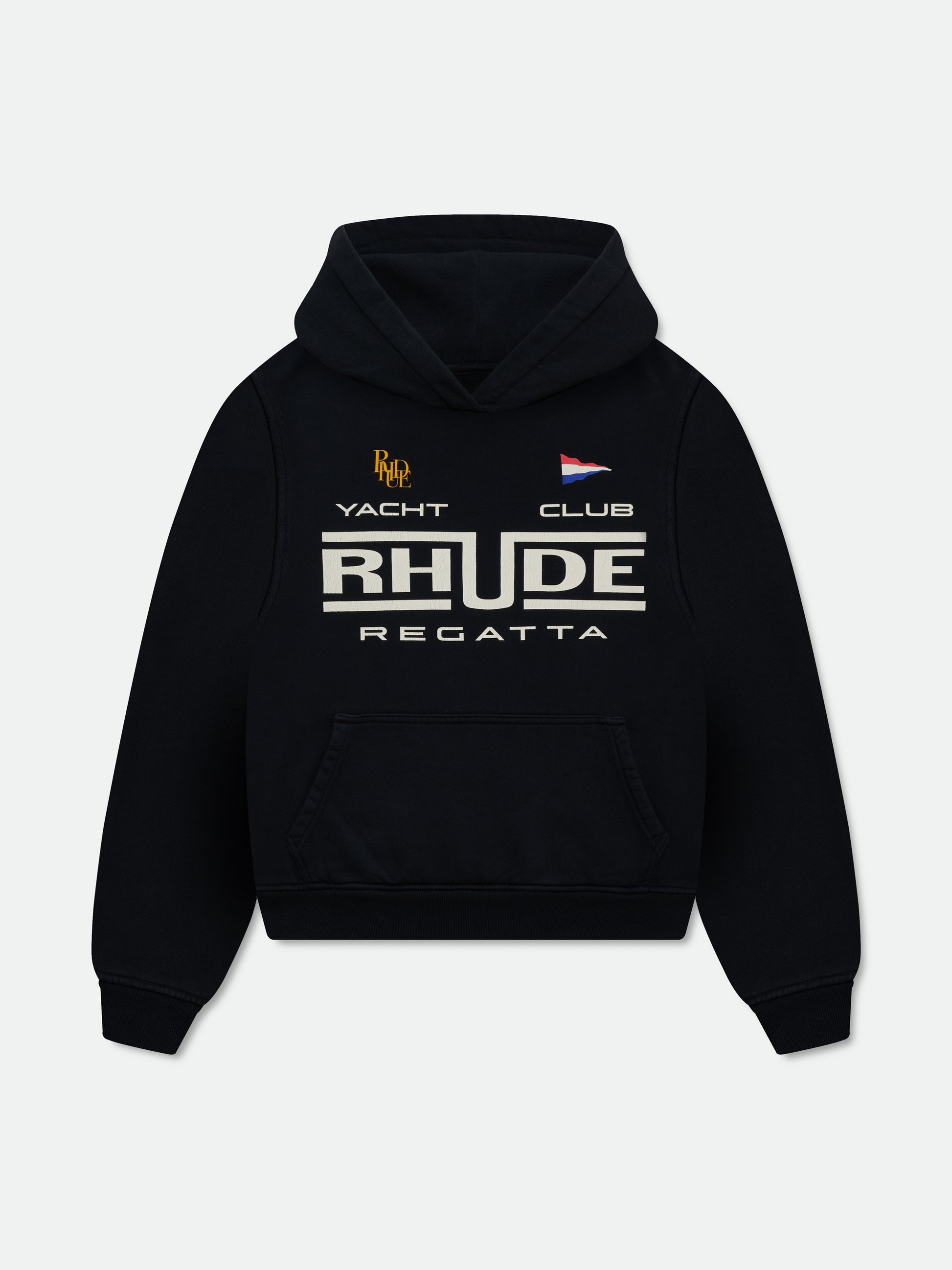 Long sleeve cotton heavyweight hoodie with Rhude "Regatta Yacht Club" graphic designs printed on the front, with a clean back. Featuring a kangaroo front pocket and dropped shoulders. Each piece is unique and print distressing my vary per style.