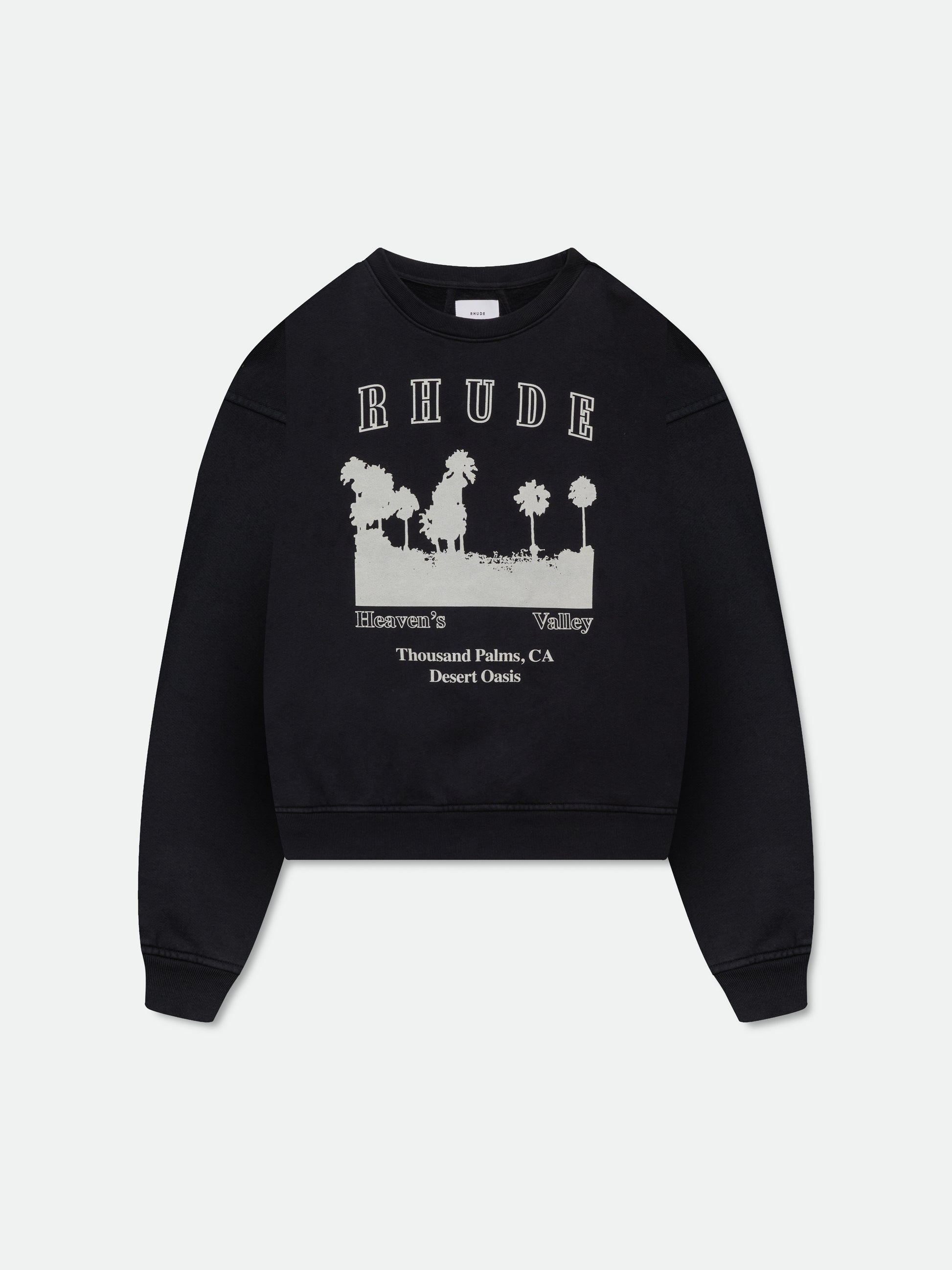 This long-sleeve cotton crewneck showcases the Rhude "Thousand Palms, CA, desert oasis" designs printed on the front, with a clean back. It features a comfortable pull over styling, and dropped shoulders for a relaxed, effortless fit.