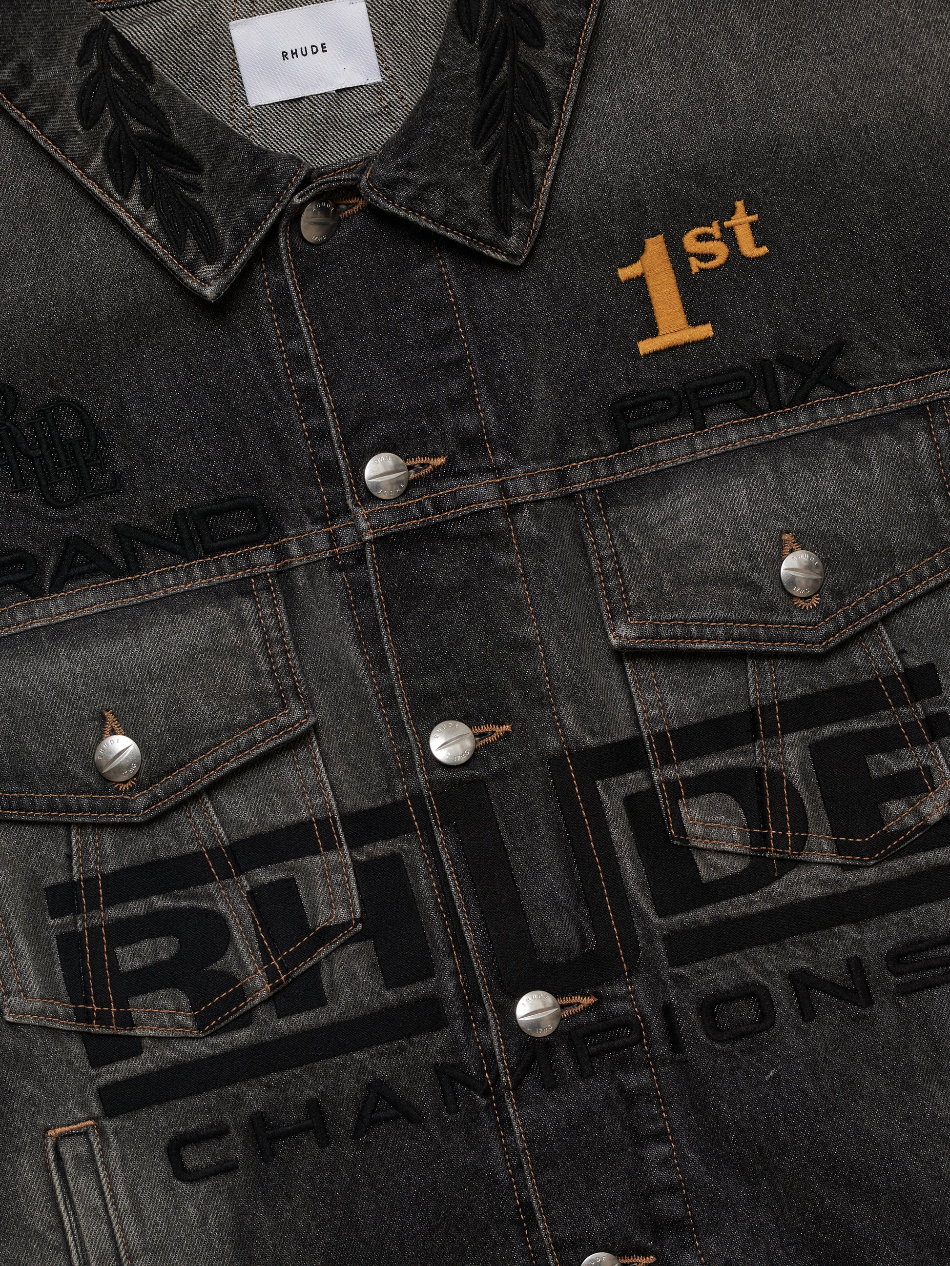 Expertly crafted with premium materials, this denim trucker jacket features RHUDE logo placed on front, embroidery details, twin pockets, and side pockets at the front. Custom Rhude button closures add unique style to this handcrafted piece. Made in Los Angeles.