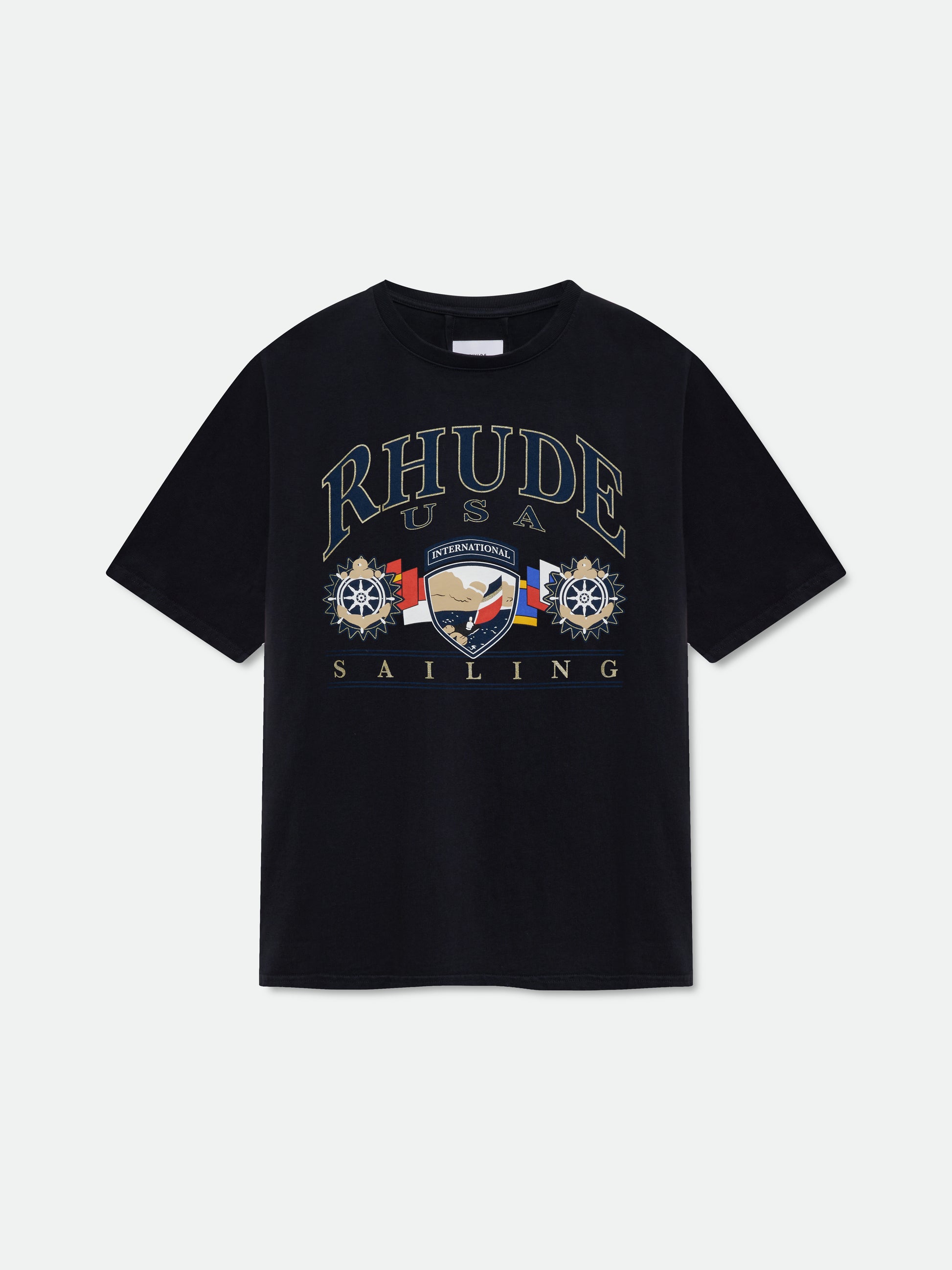 Custom-fit vintage wash cotton short sleeve tee-shirt with Rhude "USA SAILING " graphics printed at front, with a clean back.