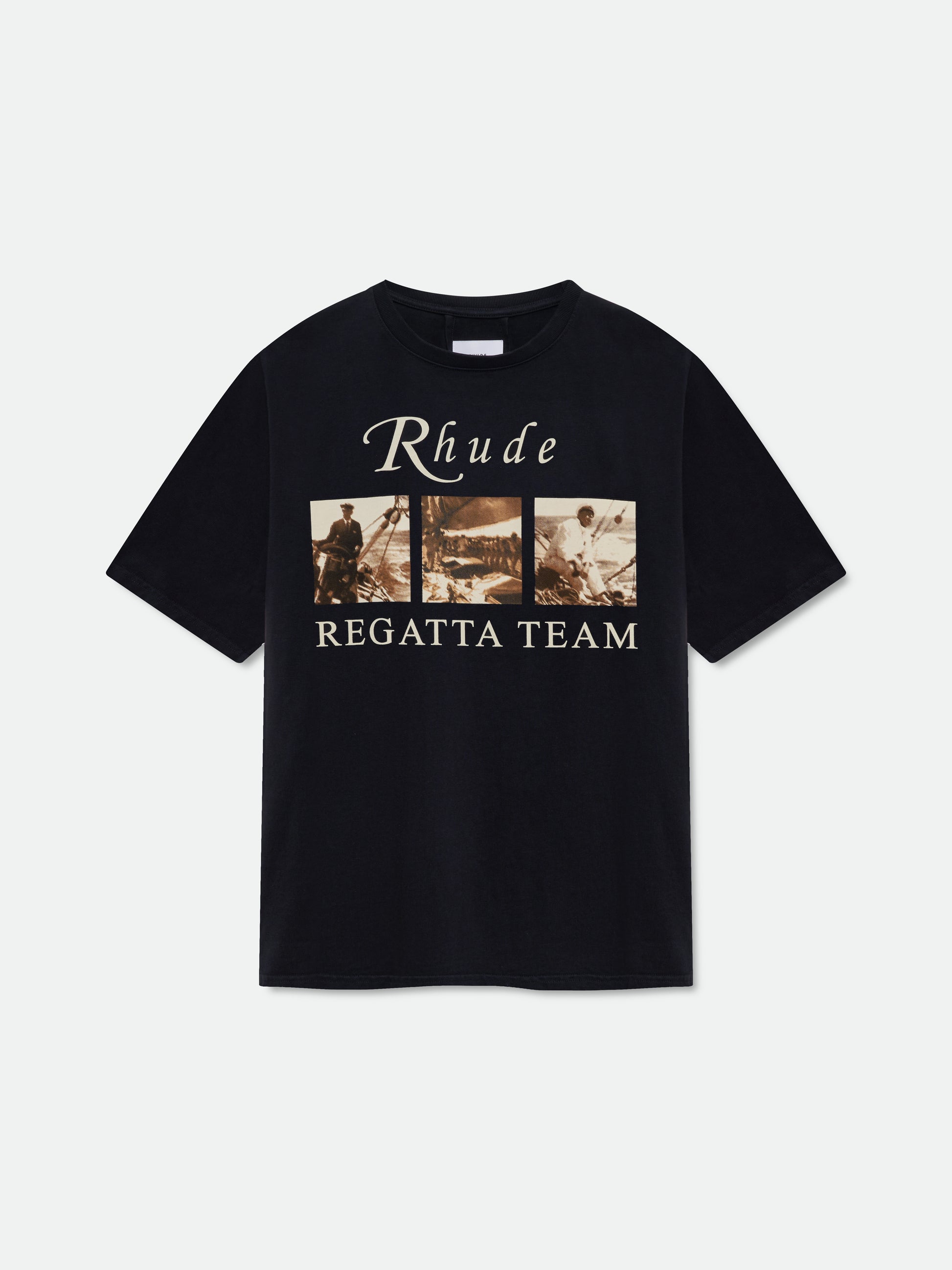Custom-fit vintage wash cotton short sleeve tee-shirt with Rhude "USVI Regatta Team" graphics printed at front and back.