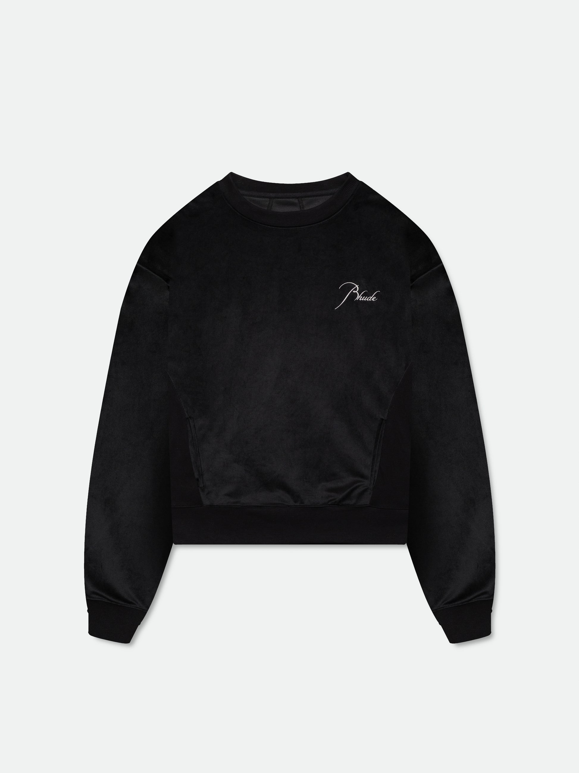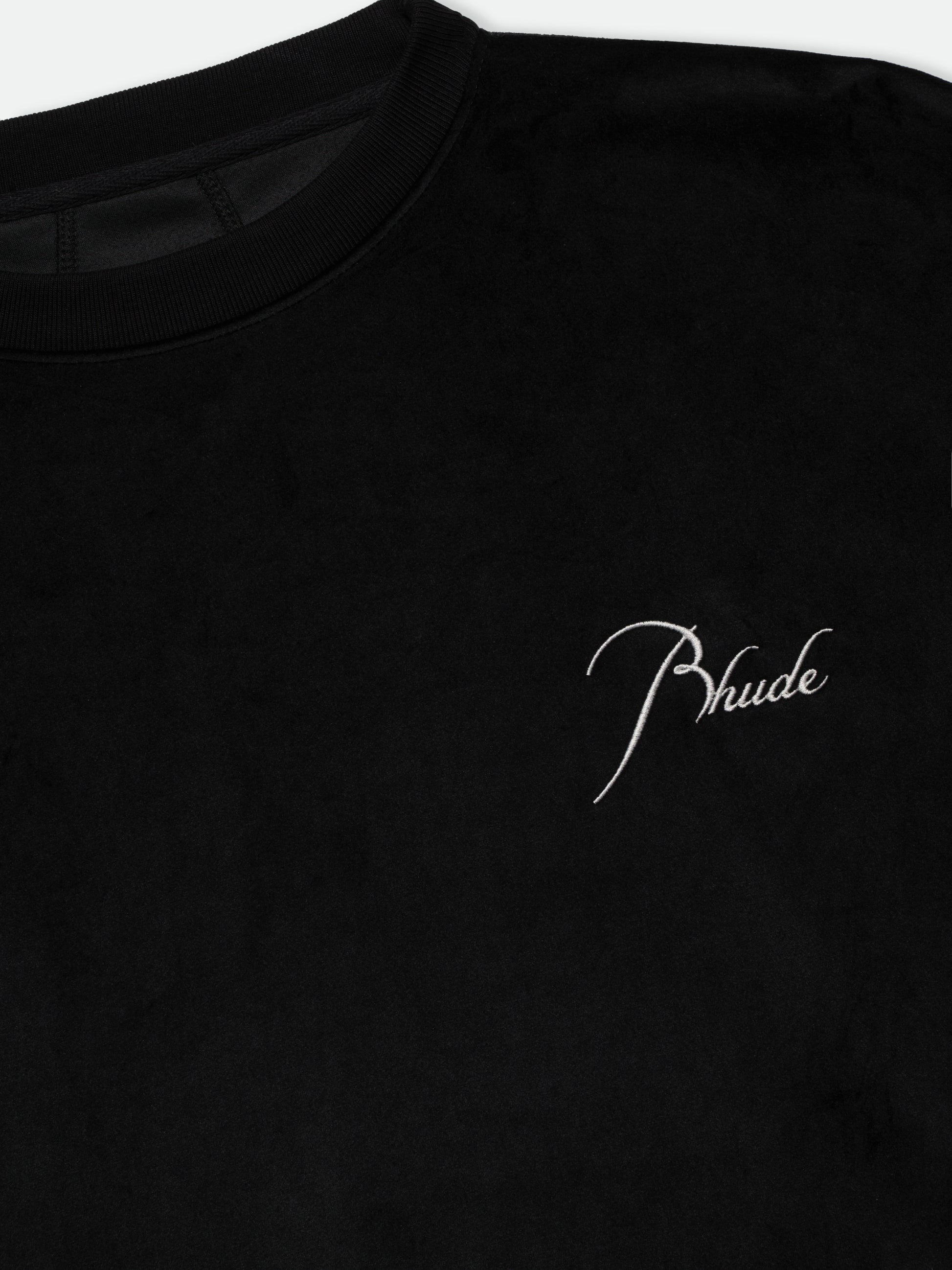 Long sleeve velour crewneck with Rhude classique script logo embroidered on the front, with a clean back. Featuring a kangaroo front pocket, dropped shoulders, and pull over styling.